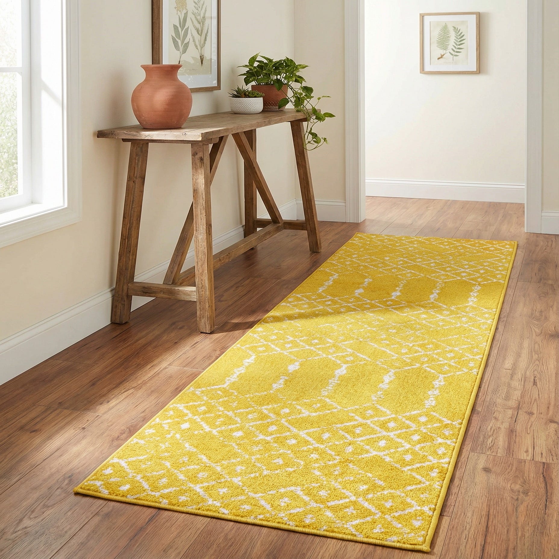 A bright yellow ground sets the stage for a crisp ivory trellis pattern that repeats across the length of this runner. Diamond motifs and small medallion accents create a geometric, slightly Moroccan-inspired layout, while elongated vertical elements add rhythm and movement. The surface has a low-to-medium pile with a tightly tufted texture you can feel underfoot; machine made of 100% polypropylene, the construction yields a firm, textured hand that still reads comfortably in a home setting.