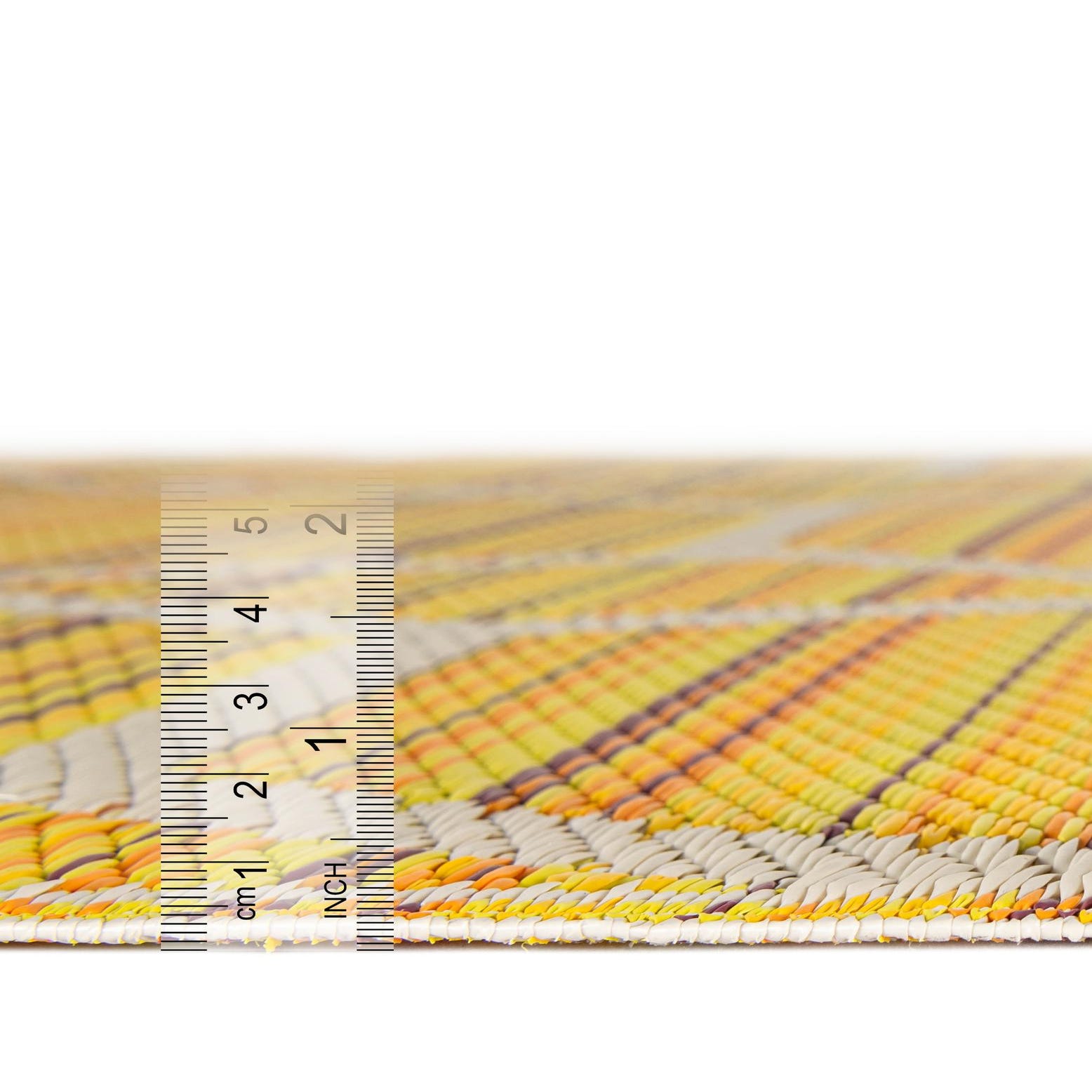 A bold, geometric runner with a sunny yellow field grounded by a repeating ivory lattice of elongated hexagons. Thin brown and ivory striations run across each section, giving the surface a layered, hand-woven look while the low-profile, flat-woven construction provides a subtle ribbed texture underfoot. Machine-made of 100% polypropylene, the rug maintains a crisp pattern and color saturation that reads clean and modern.