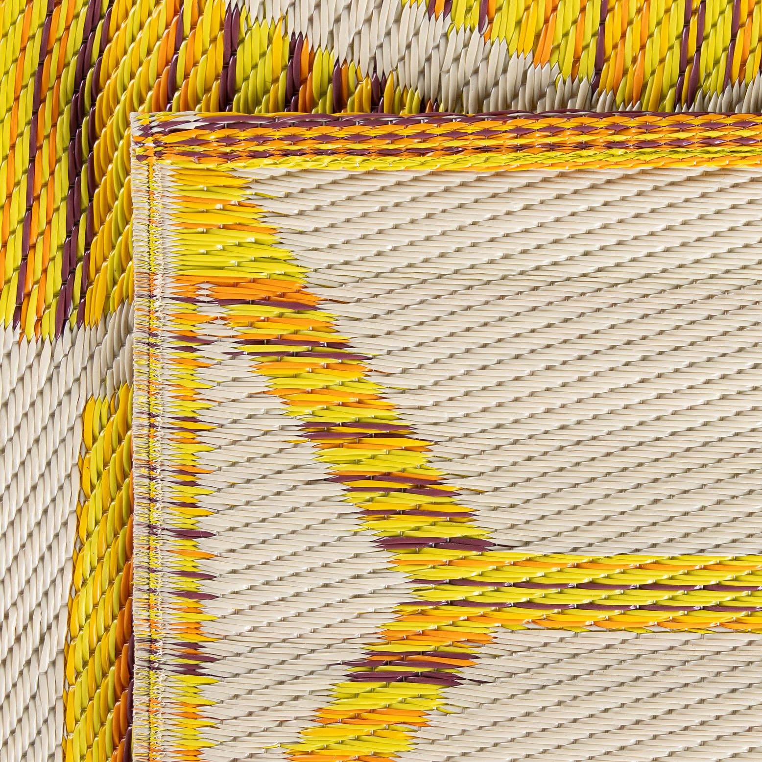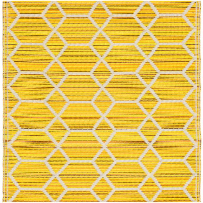 A 6 ft yellow runner rug with a modern geometric pattern of interlocking white hexagons, suitable for indoor/outdoor use.