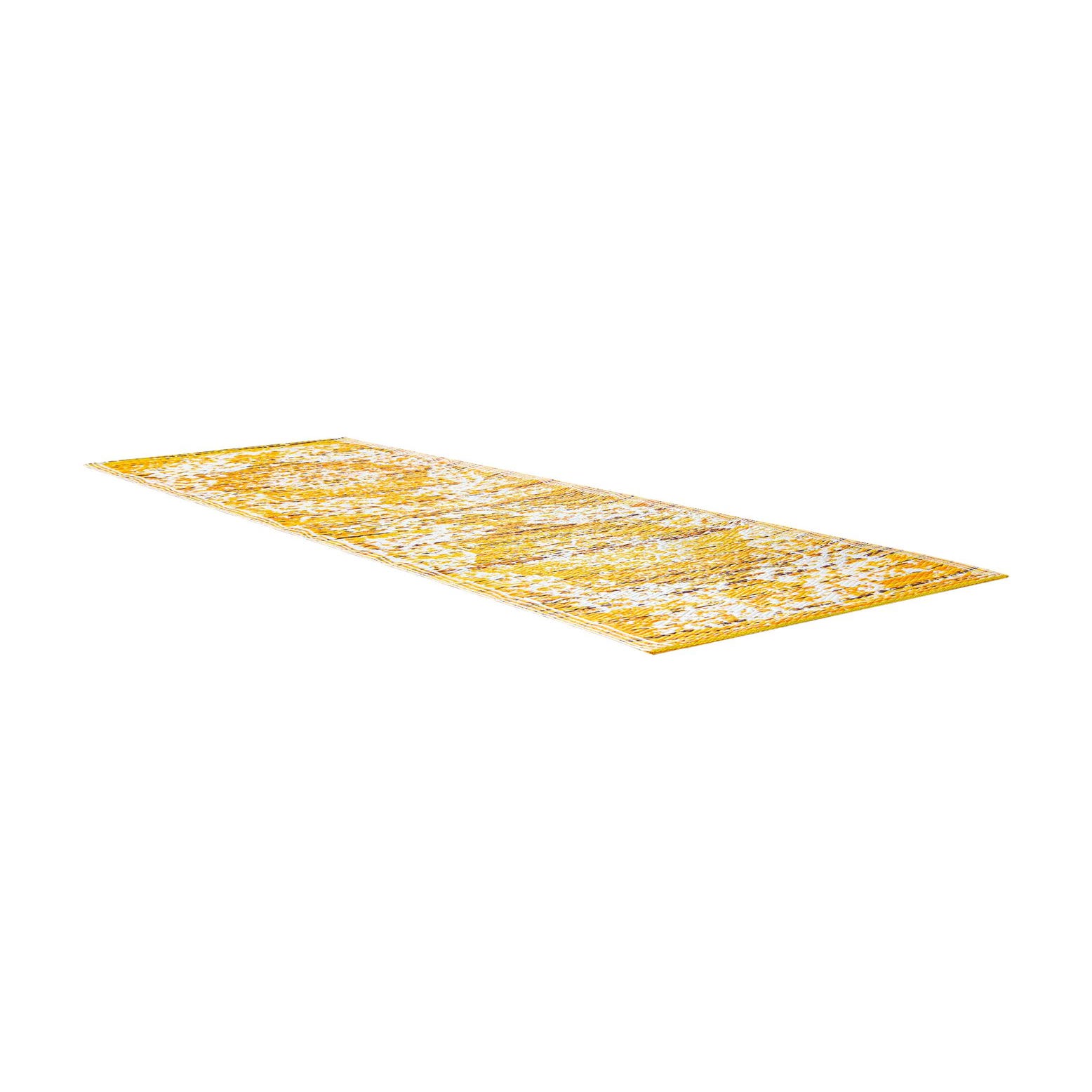 A 6 ft runner rug with a modern abstract pattern in shades of yellow, gold, and white, suitable for indoor or outdoor use.