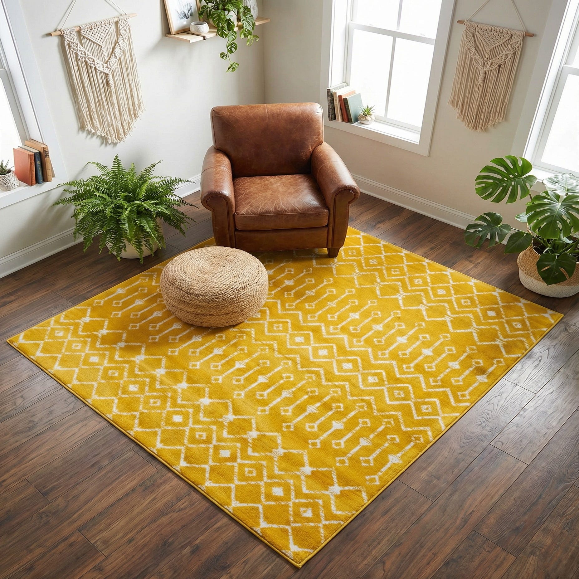 Machine-made from 100% polypropylene, the pile is low-profile and smooth to the touch while maintaining clear pattern definition. Place it under a coffee table to anchor a sunny living room, layer it at the foot of a bed to add a pop of color to a neutral bedroom, or use it in an entryway or home office to introduce warmth and personality.