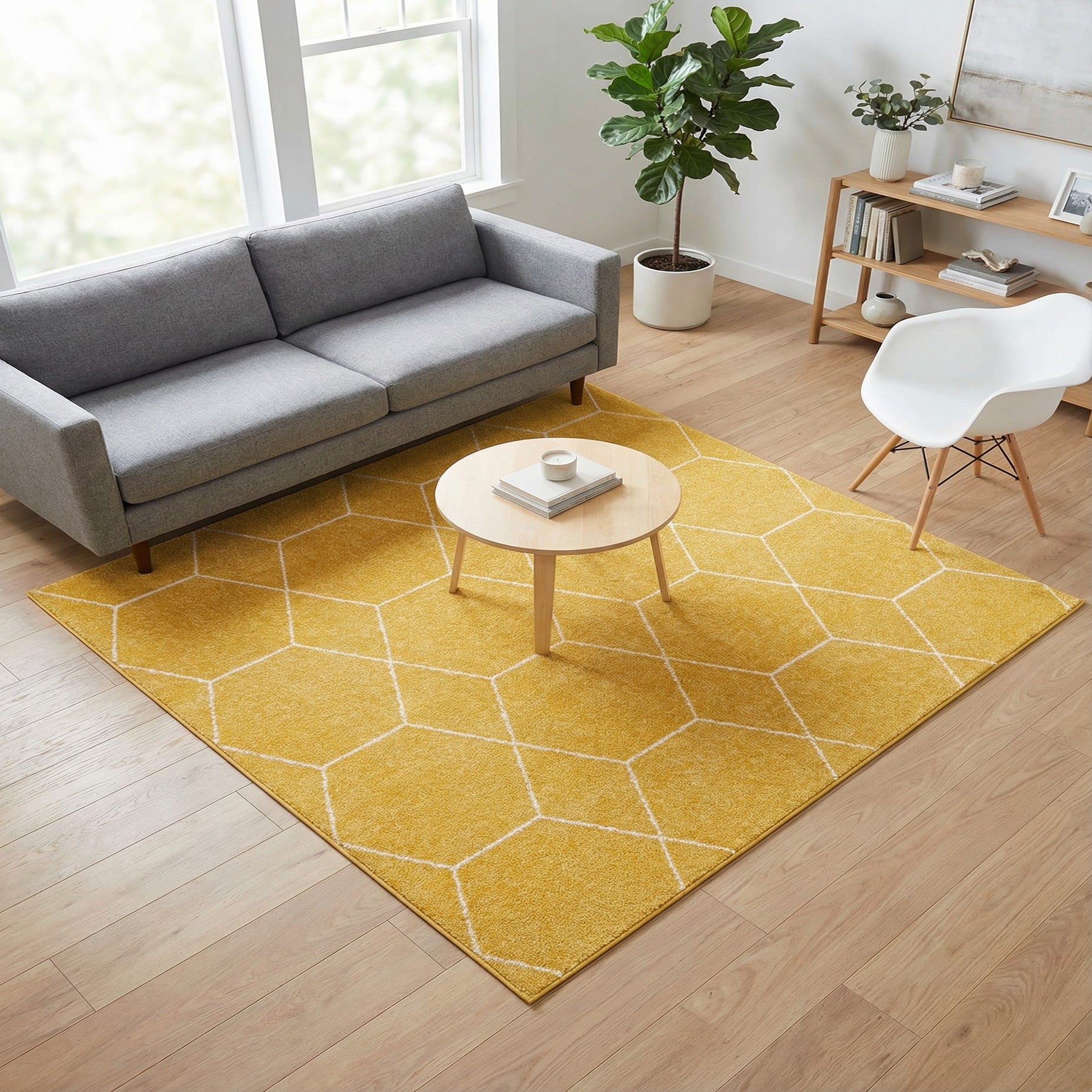 A sunny yellow field is patterned with a bold, oversized hexagonal lattice outlined in clean ivory lines, giving the rug a modern geometric look with a subtle nod to midcentury motifs. The pattern is crisp and graphic without feeling busy, and the short, slightly textured pile has a soft hand that feels comfortable underfoot. Machine-made from 100% polypropylene, the construction produces a uniform surface and consistent color across the design.