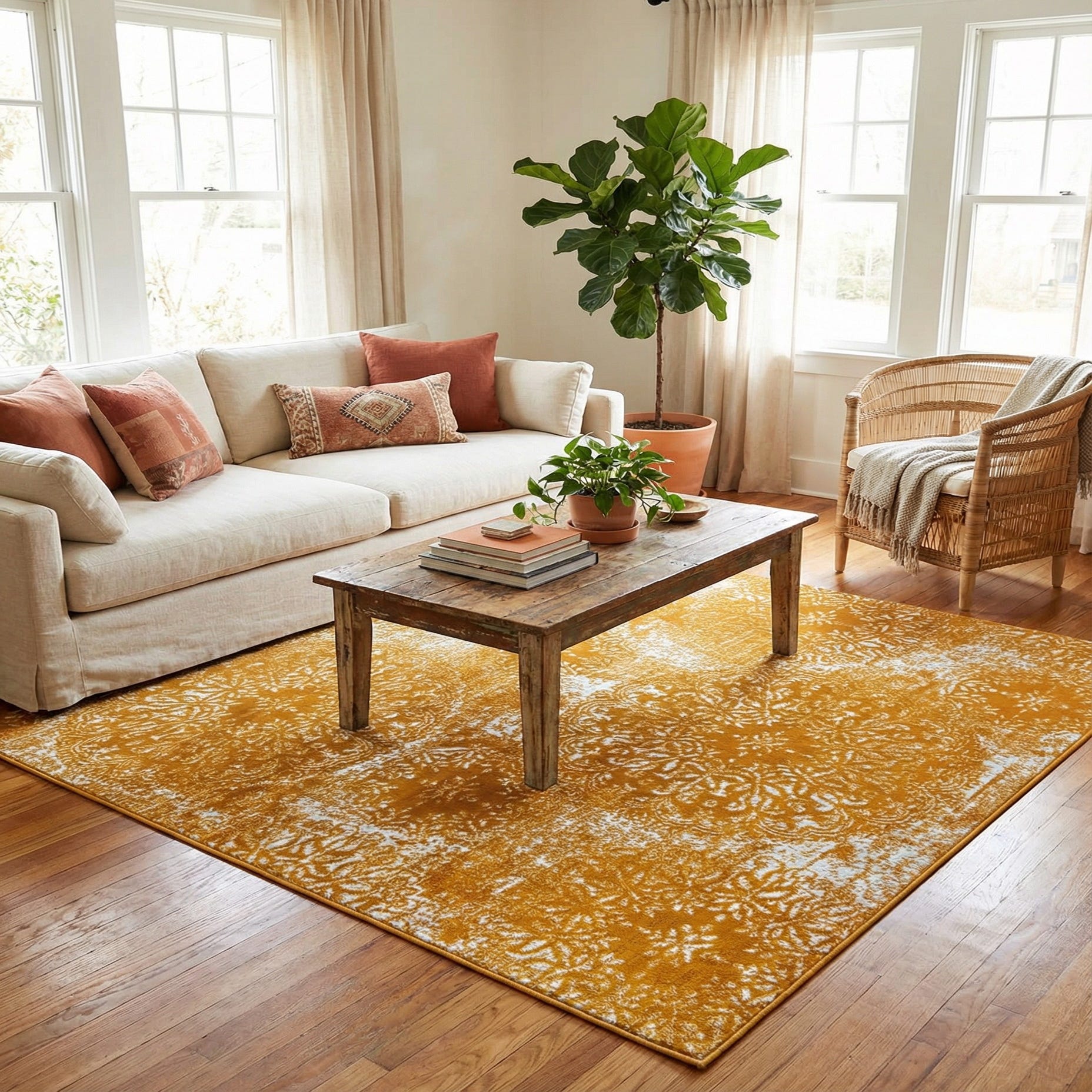 The bold yellow hue serves as an eye-catching foundation for any room, making it an ideal choice for spaces in need of an energetic focal point. The intricate ivory designs lend themselves to a variety of interior design themes from contemporary to traditional, easily complementing neutral color palettes and adding contrast to darker furnishings. This rug could be an outstanding addition to a living room, study, or bedroom, especially one that features natural light to highlight its color and pattern. It seamlessly marries practicality and style, suitable for busy households and design-forward interiors alike.