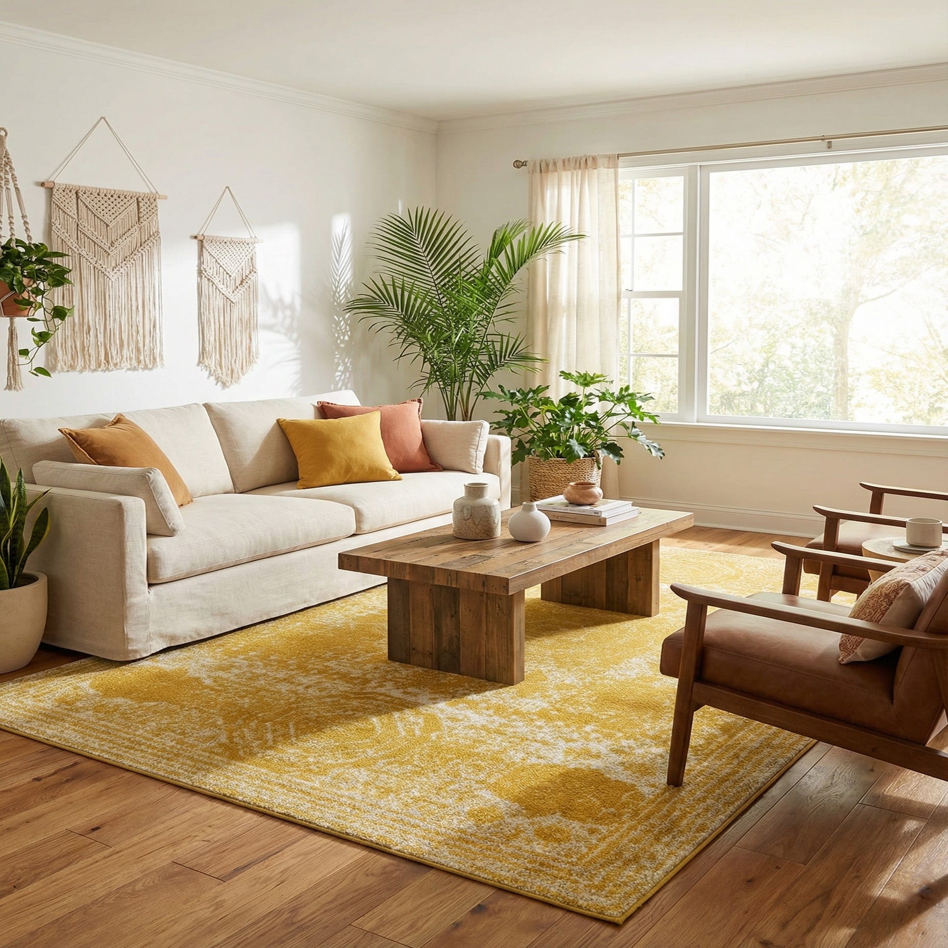 Machine-made of 100% polypropylene, the surface has a low, dense pile that feels softly cushioned and slightly brushed underfoot, with the ivory highlights offering a gentle textural contrast to the yellow ground. This rug works well beneath a coffee table in a light-filled living room, as an inviting anchor in a casual dining area with natural wood furniture, or to add a sunny focal point to a neutral bedroom. Pair it with ivory linens and warm wood tones for a cohesive look, or introduce black metal accents and cool grays to balance the color.