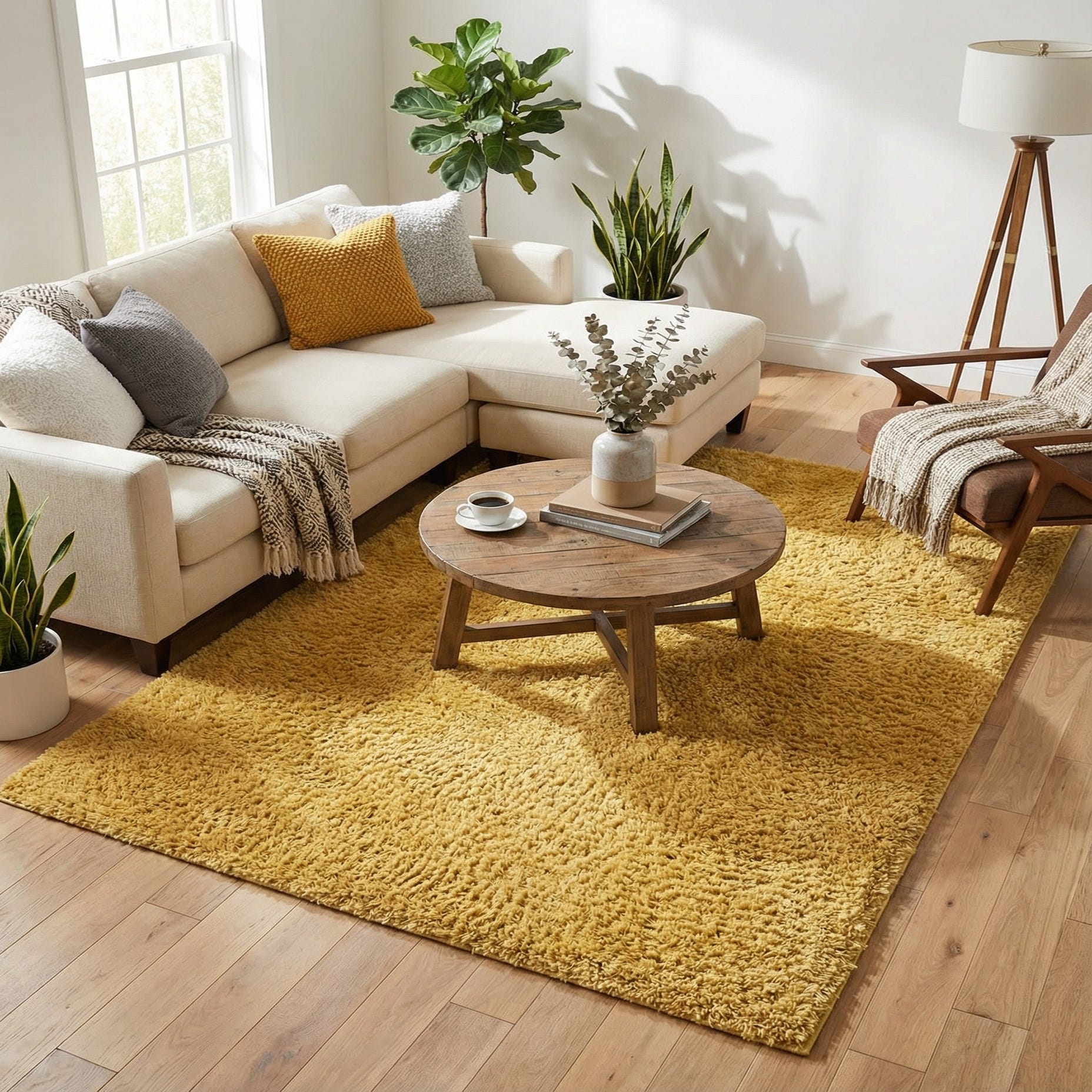 This yellow shag fits well in casual and contemporary interiors: place it under a low-profile sofa to warm a living room, use it to define a cozy reading nook, or anchor a playful family room or kids’ space. It pairs naturally with natural wood tones, navy or charcoal accents, and simple modern furnishings for a relaxed, inviting layout.