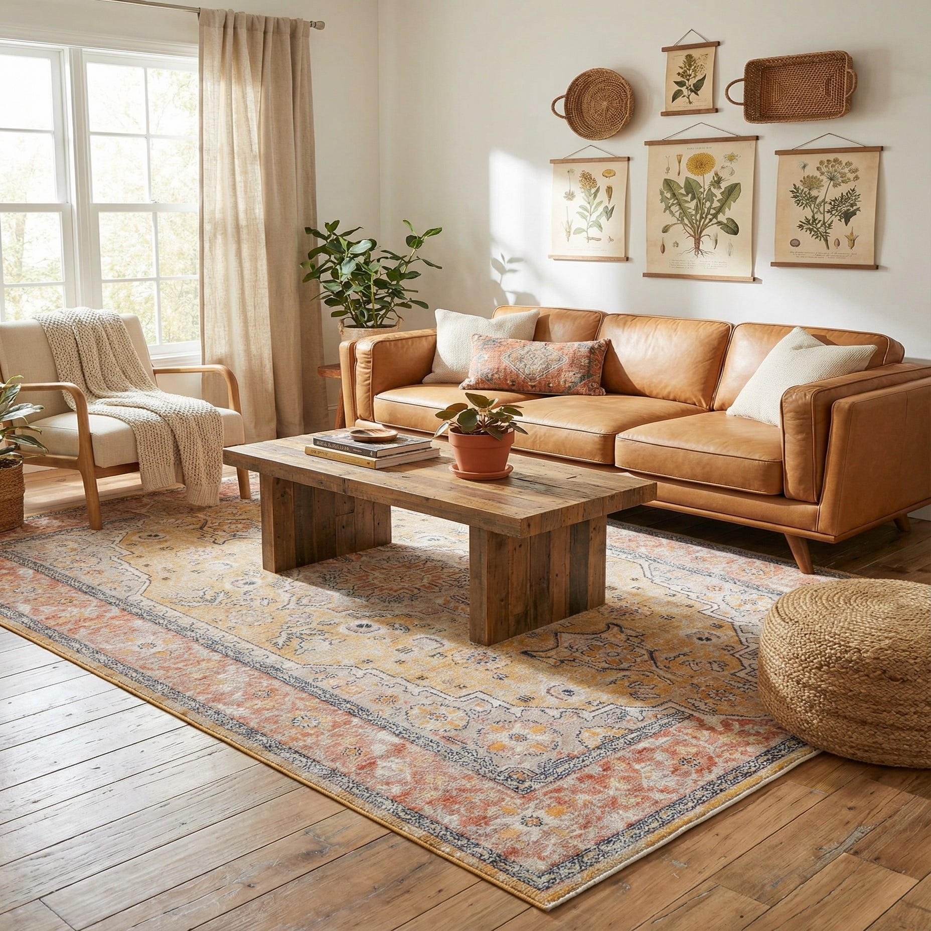 This palette and pattern work well in transitional and cottage interiors as well as sunlit living rooms or casual dining areas—use it to add a cheerful foundation beneath neutral furnishings or to complement blue and terracotta accents. It also fits nicely in a layered bohemian scheme, paired with natural wood pieces and textured throws, or in a modern farmhouse setting where the warm yellow and rust tones bring energy without overpowering the space.