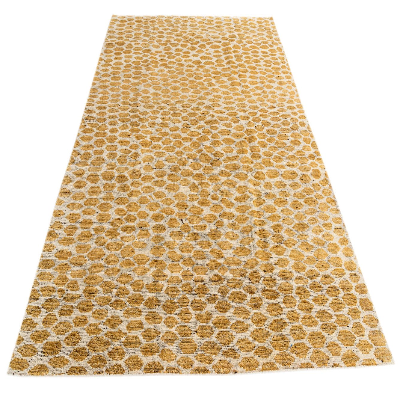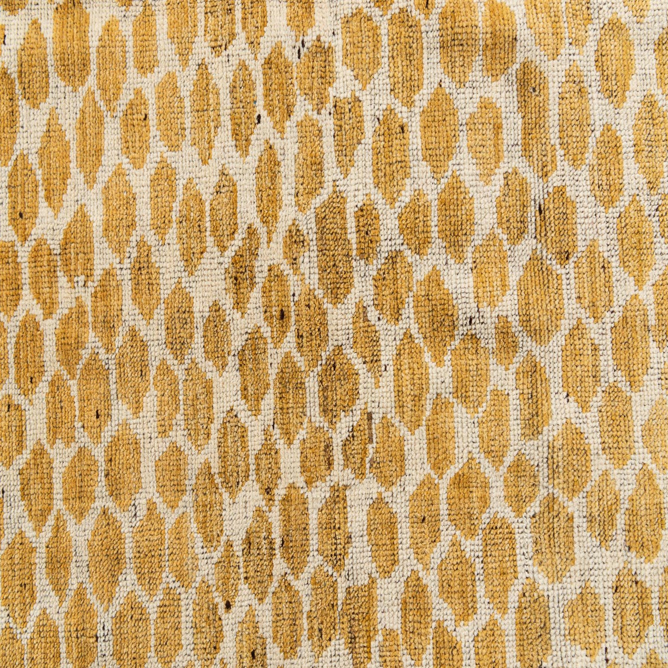 A 6x9 rectangular yellow and cream tribal shag rug with an abstract dotted pattern, suitable for a living room.