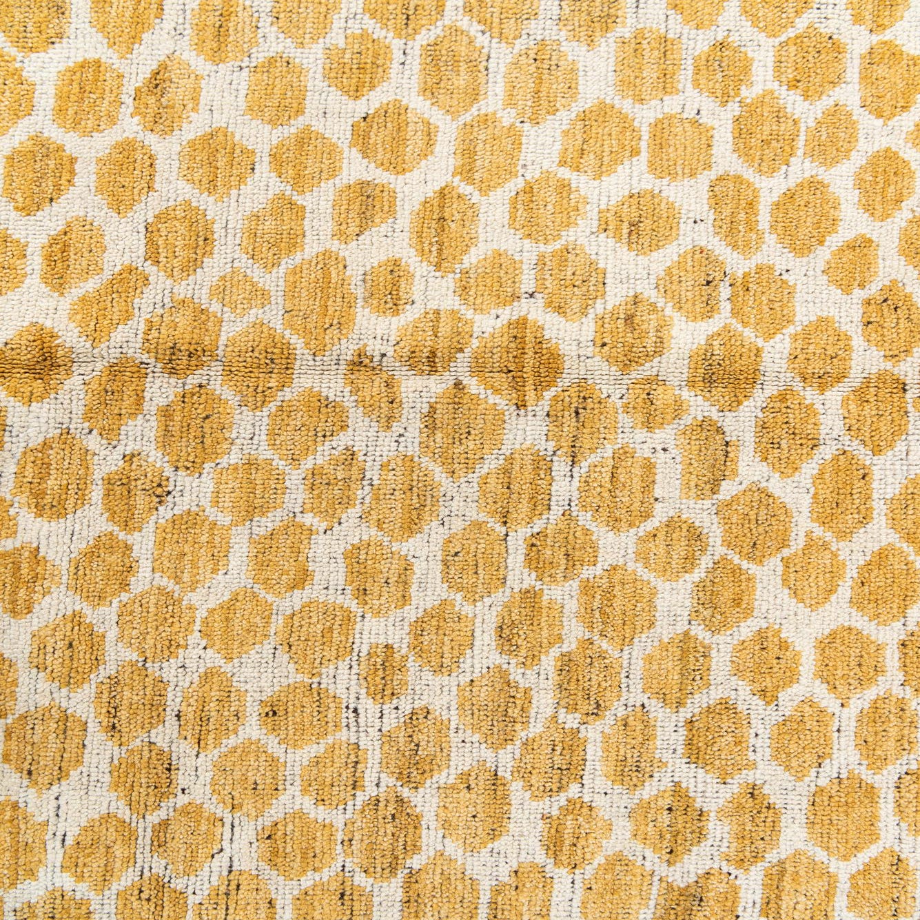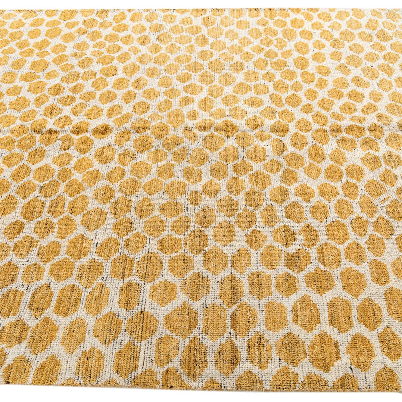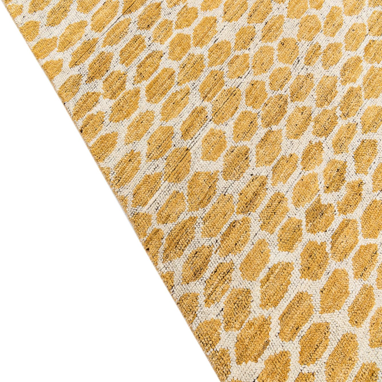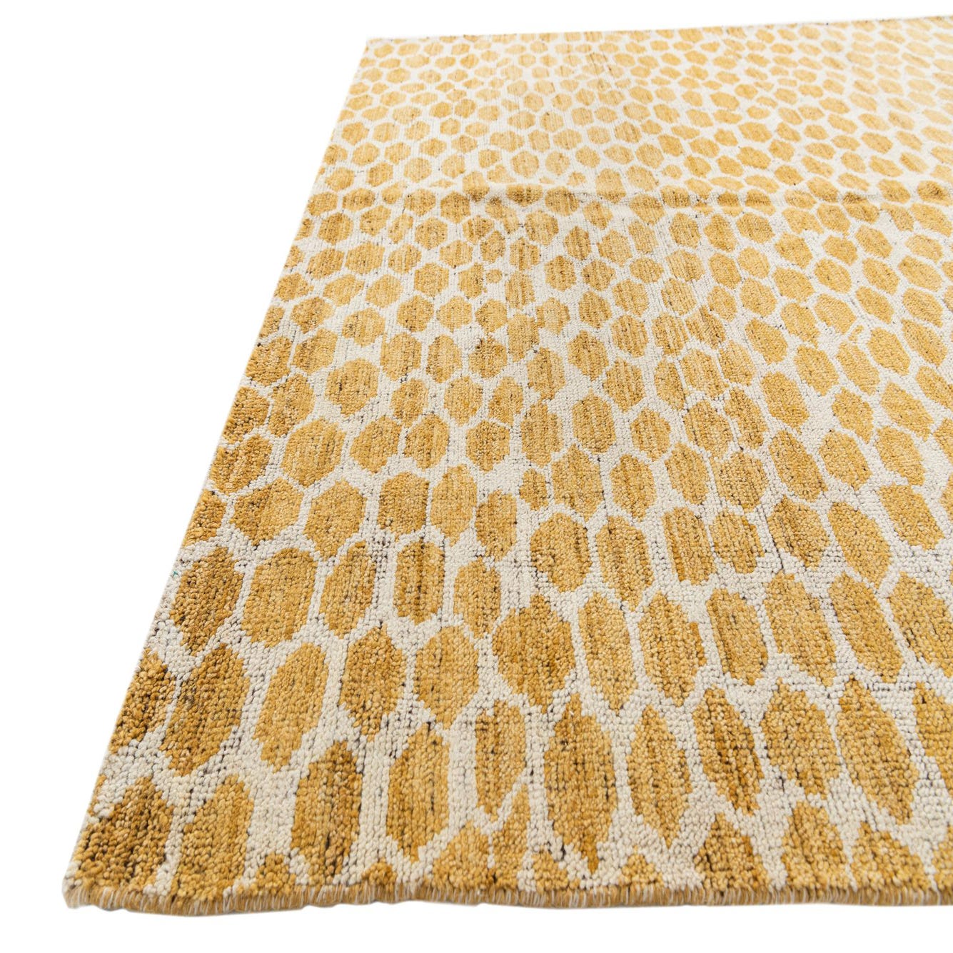 This Moroccan collection rug presents a modern twist on traditional design, boasting a vibrant yellow background with ivory accents. Measuring 6x9 feet, this piece is hand-knotted from 100% wool, ensuring durability and a soft touch underfoot. The rug exhibits an eclectic pattern reminiscent of organic shapes and pebble motifs, adding texture and visual interest to the floor space it occupies.
