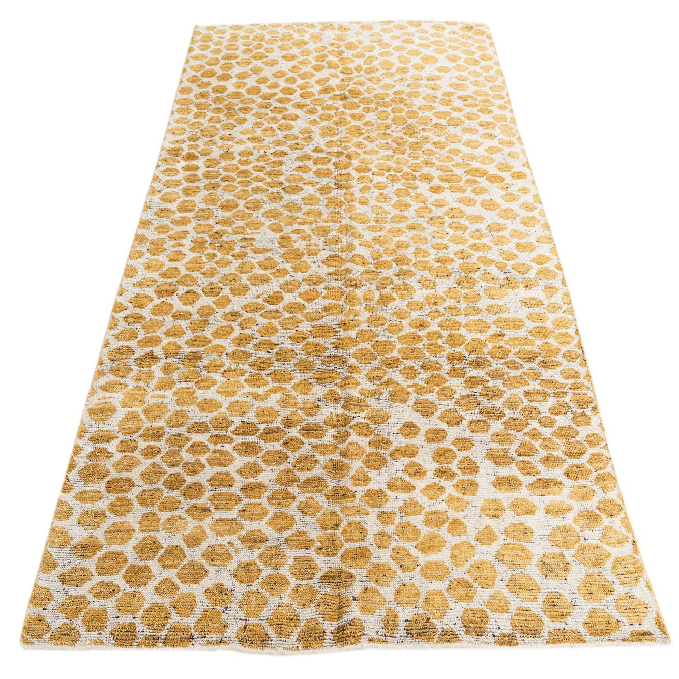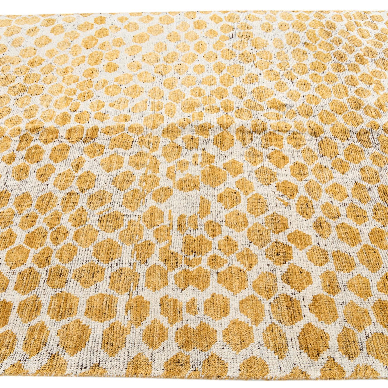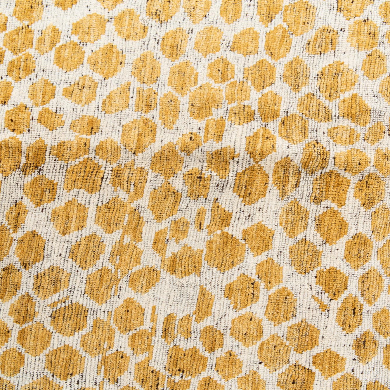 Hand-knotted from 100% wool, this rug features a warm yellow ground punctuated by an allover arrangement of ivory, pebble-like motifs. The pattern combines rounded hexagonal and oval shapes in a relaxed grid that reads contemporary with a subtle nod to handcrafted textile traditions. The wool pile has a soft, slightly uneven hand—visible knotting and gentle variations in height give the surface a tactile quality and a comfortable, grounded feel underfoot.
