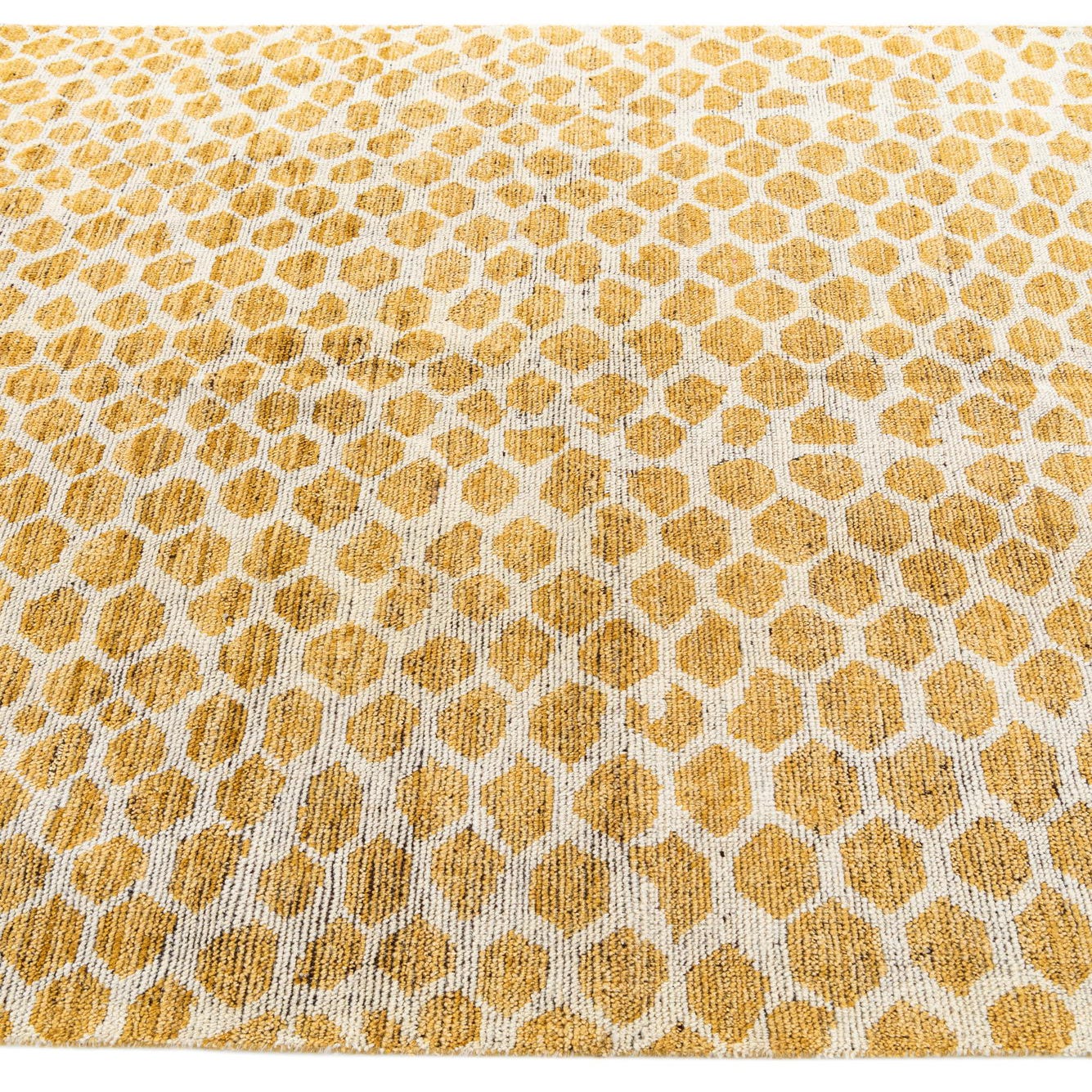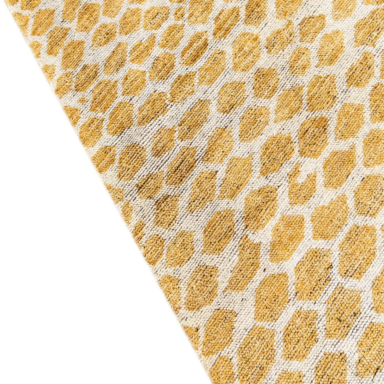 Part of the Moroccan collection, this 6x9 hand-knotted rug is woven from 100% wool, providing a tactile experience that speaks of comfort and craftsmanship. The rug features a distinctive pattern reminiscent of traditional Moroccan designs, with a modernized geometric lattice showcased in yellow and ivory hues. The rich yellow background is complemented by ivory detailing, lending this piece a bright yet balanced visual appeal.