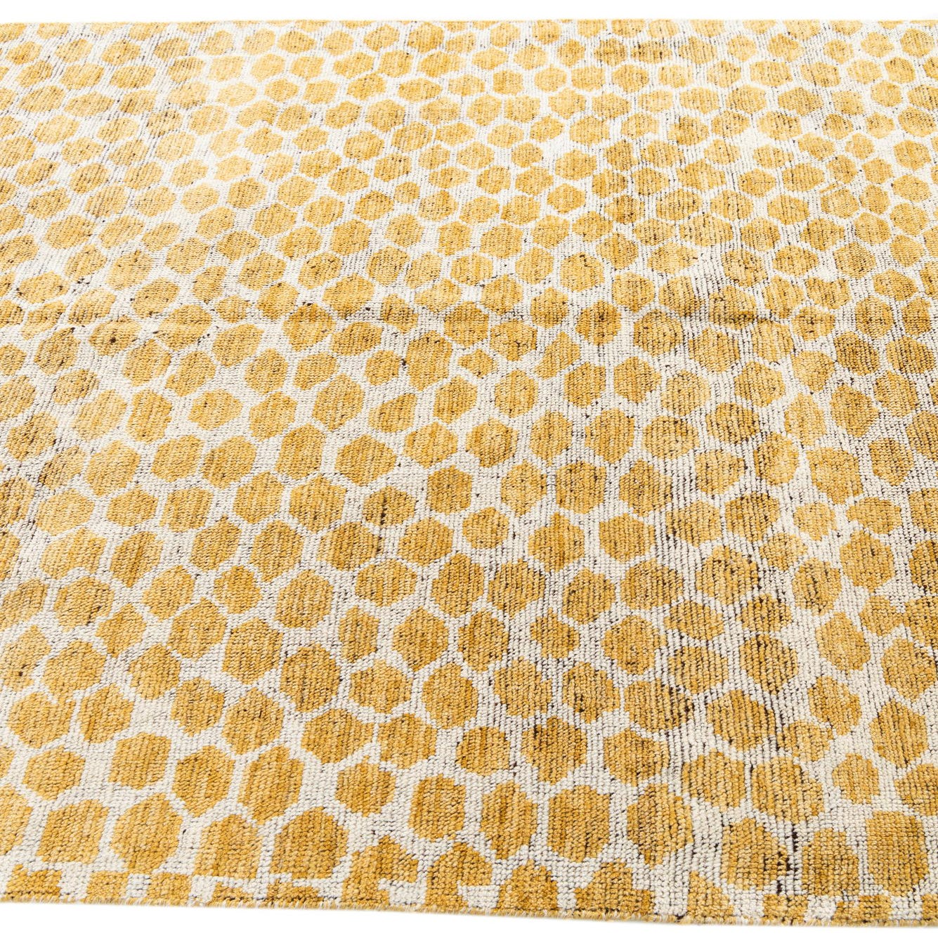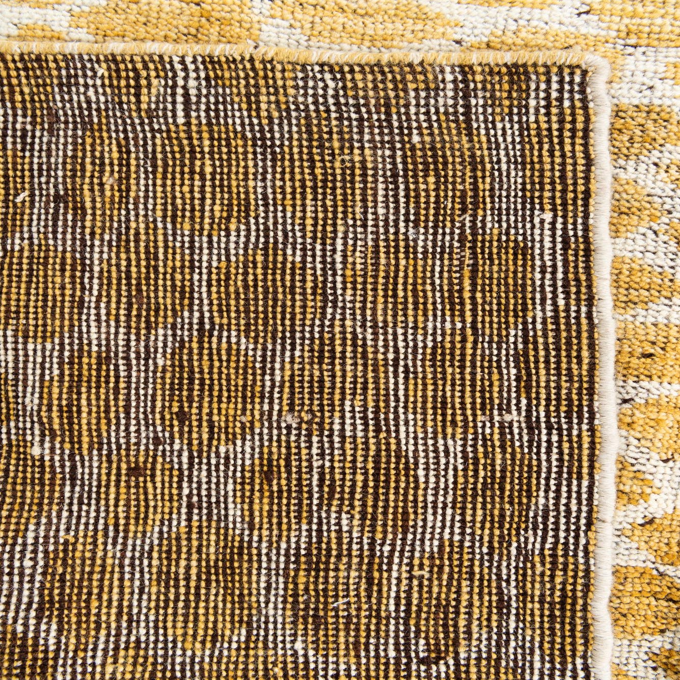 This Moroccan collection rug is a hand-knotted piece constructed from 100% wool, offering a unique blend of durability and comfort underfoot. It measures 6x9, making it versatile for a range of room sizes and furniture layouts. The rug showcases a dynamic pattern composed of repeating abstract shapes that create a sense of movement across the field. Its color palette is focused on a warm yellow background with ivory accents which contribute to a welcoming and vibrant aesthetic.