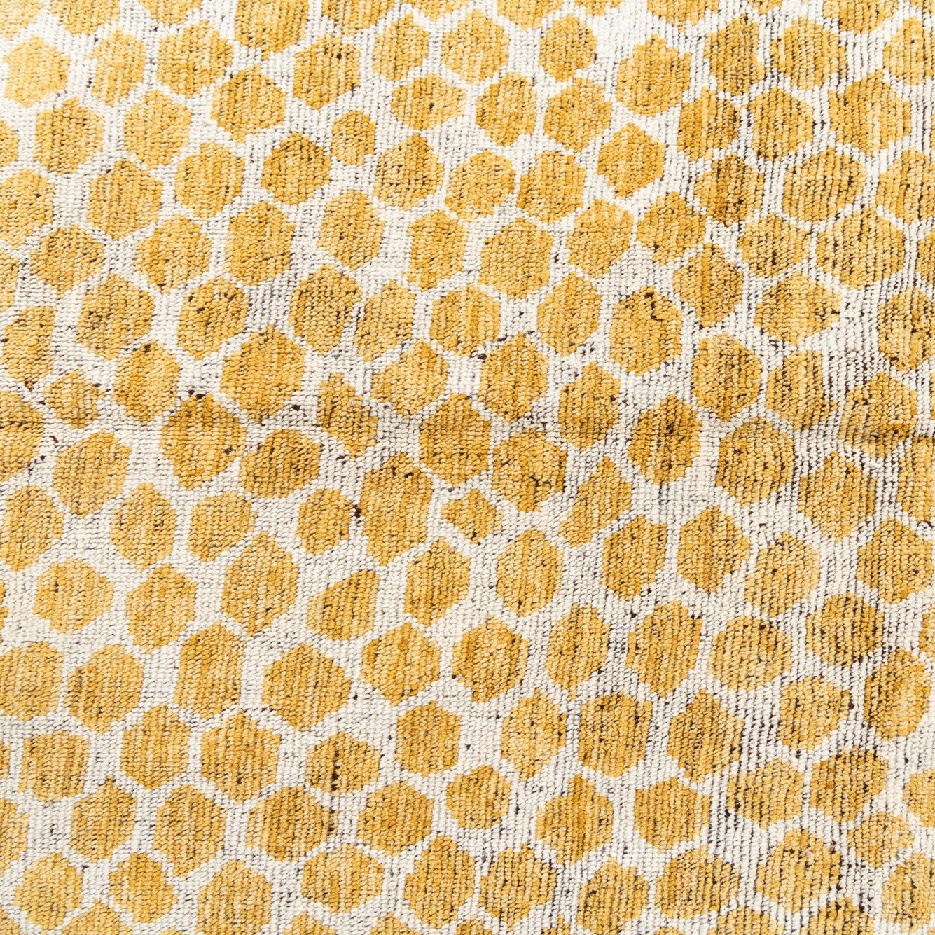 This rug would seamlessly integrate into interiors that nod to both traditional and modern influences. In a contemporary setting, it can serve as a striking focal point that adds warmth and character. For rooms with a more classic or bohemian approach, the rug's artisanal qualities and organic motif resonate well with eclectic furnishings and natural materials. Spaces with neutral tones or those incorporating wood elements will find the yellow and ivory hues of this rug to be complementary and harmonious.
