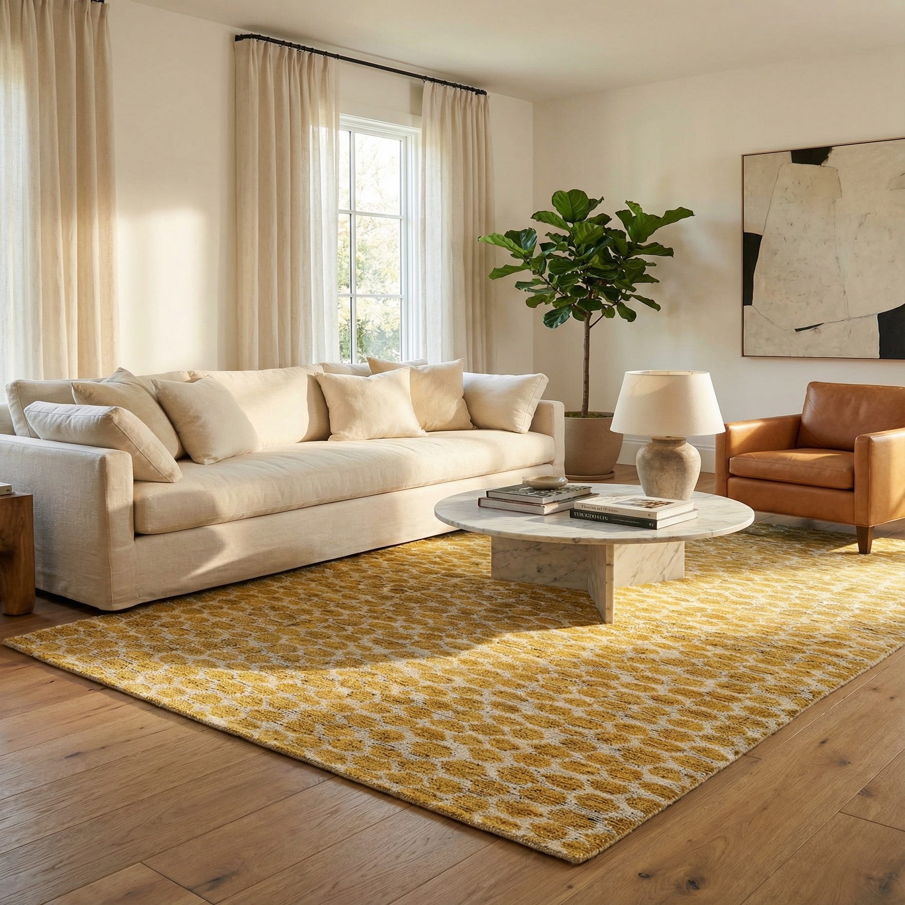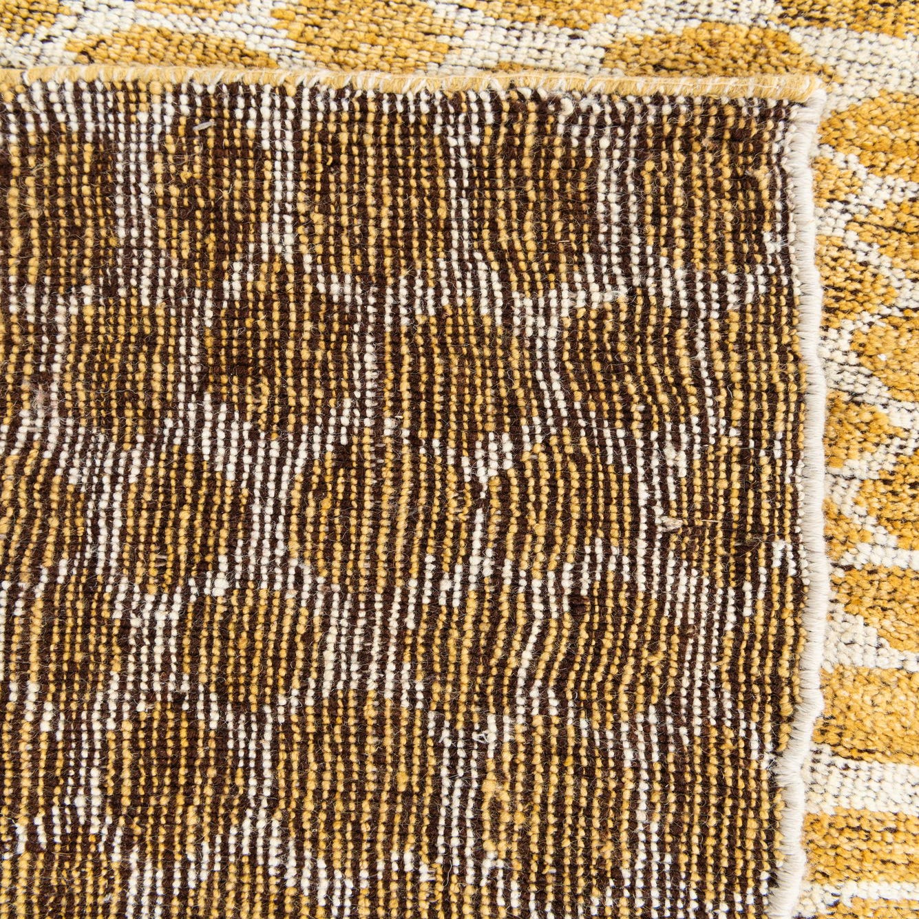 The rug's texture is enhanced by the traditional hand-knotting technique, which lends an artisanal touch and ensures every piece is unique. Its color palette and pattern make it adaptable to a variety of decor styles, from modern to bohemian and even eclectic spaces looking for a pop of color. The inviting warmth of the yellow can energize a living room, bedroom, or a study, while the ivory accents can tie in with lighter furnishings to create a cohesive interior. This rug can serve as a statement piece in a minimally designed room or as a harmonious addition among bolder decor elements.