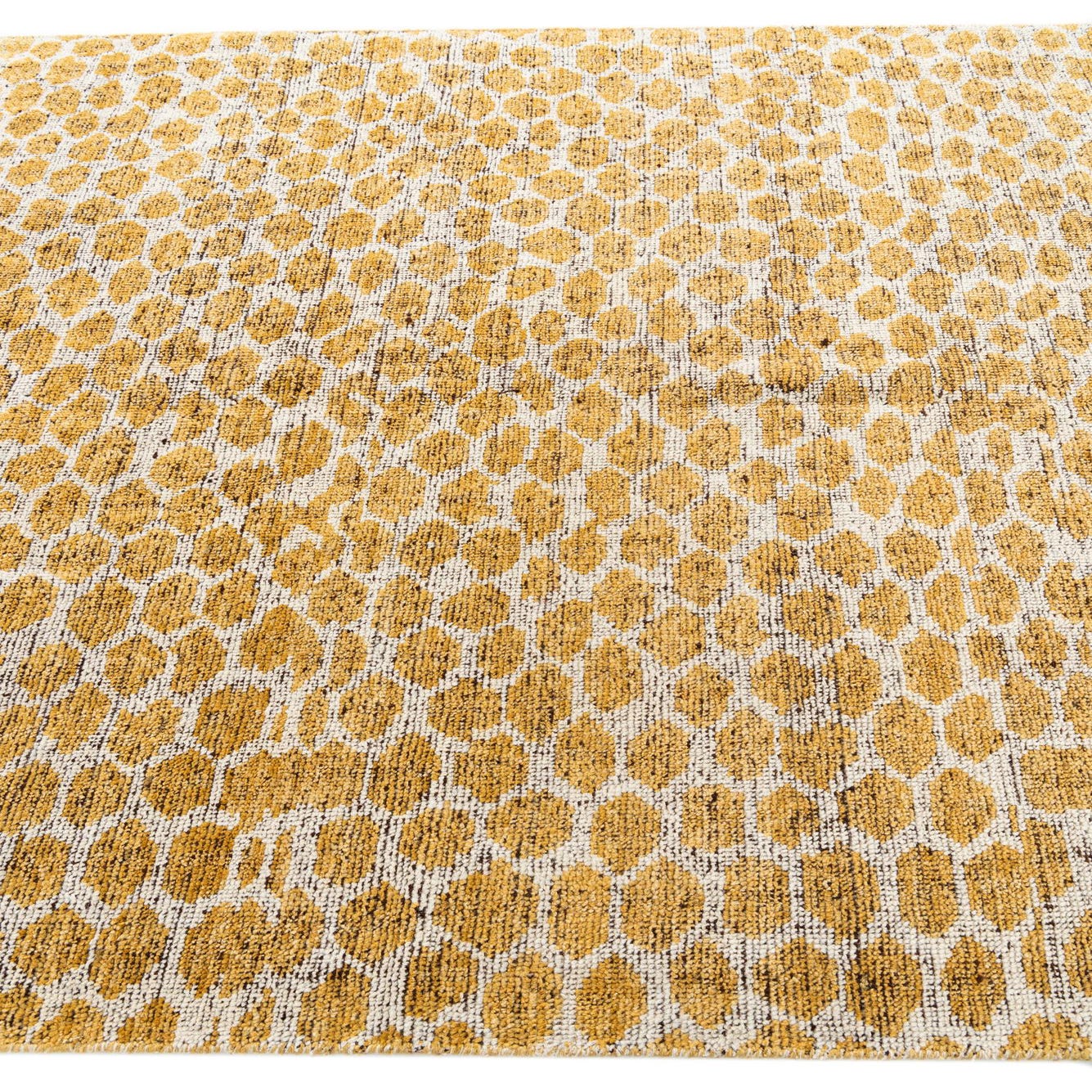 This Moroccan Collection rug is a hand-knotted 6x9 piece crafted from 100% wool, highlighting its durability and offering a plush, inviting texture. It presents a bold yellow background with an organic ivory pattern that provides a cheerful and sunny disposition to any space. The symmetrical design evokes a sense of harmony and order, lending itself to a range of interior styles.