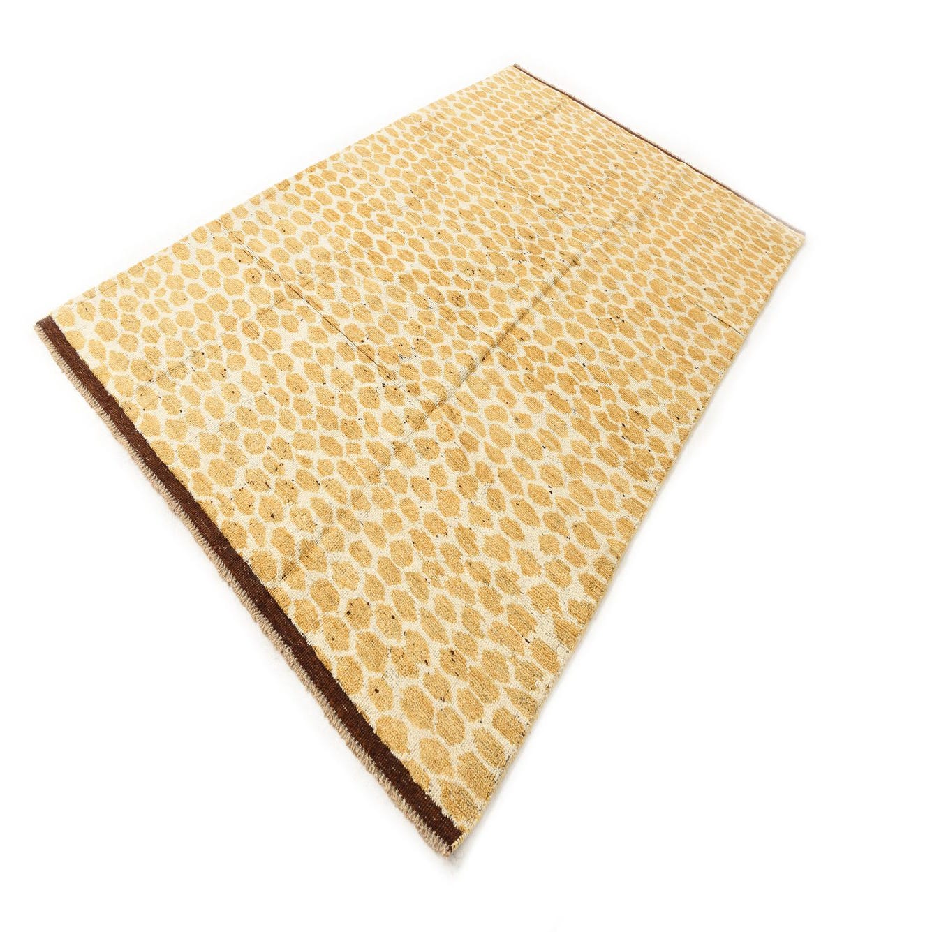 A 6x9 rectangular yellow and cream tribal shag rug with an abstract pattern and dark brown border.