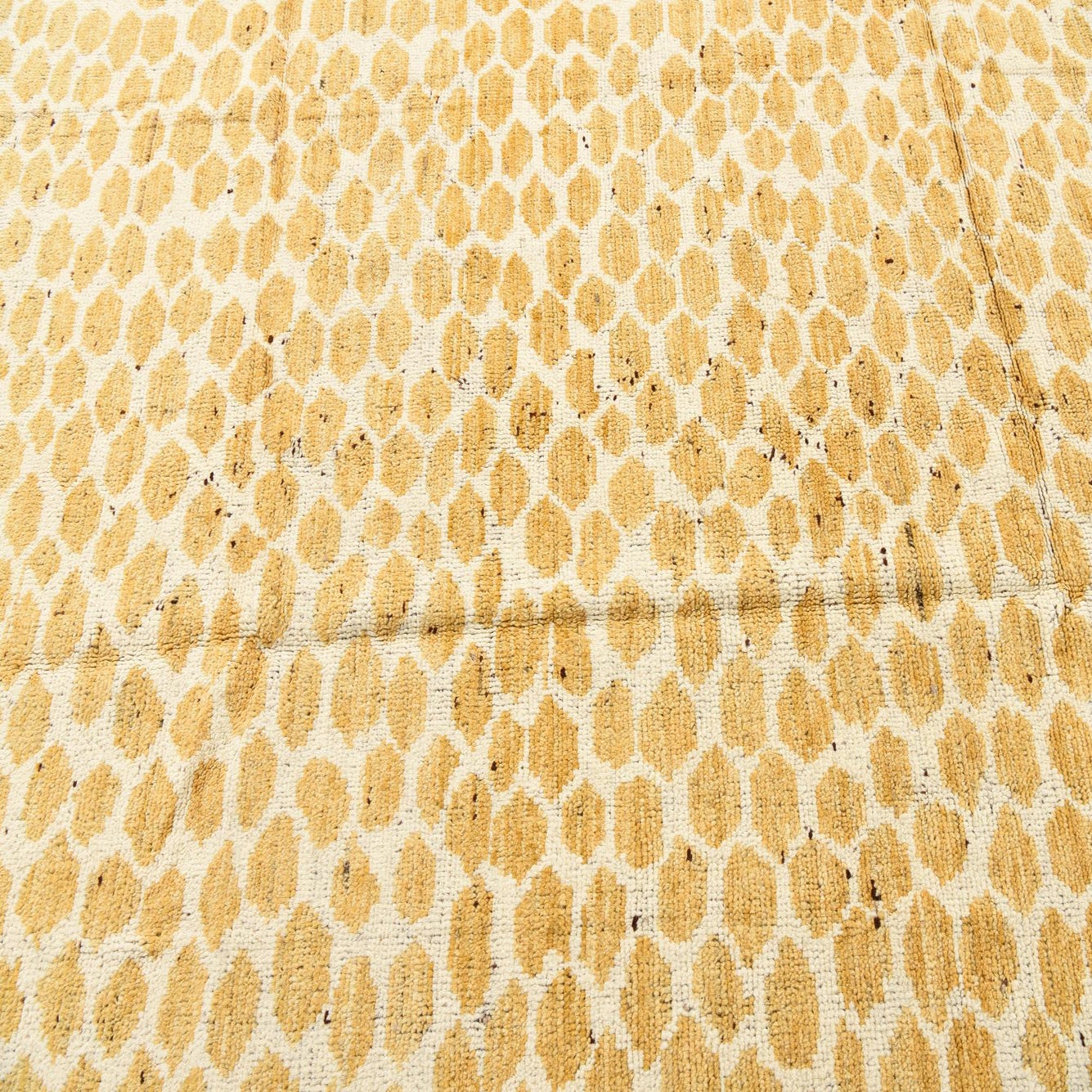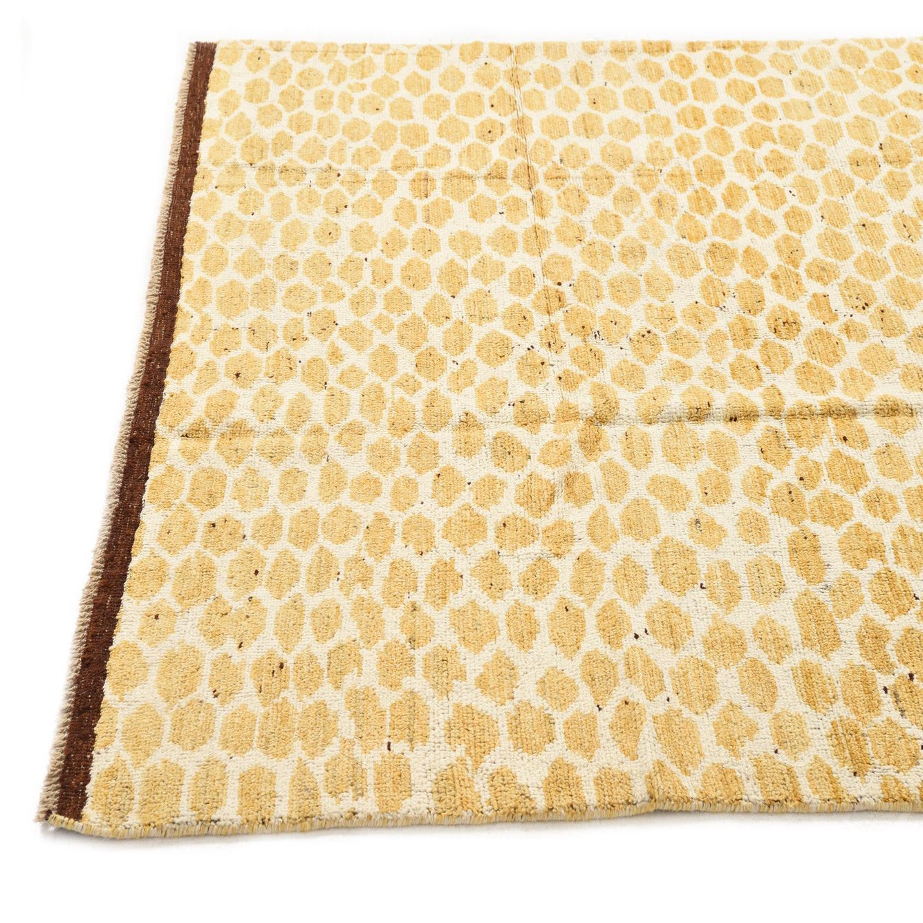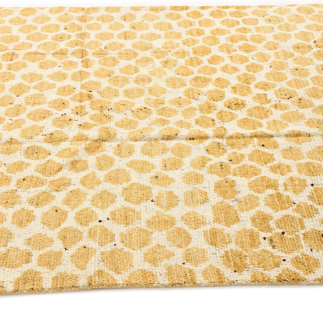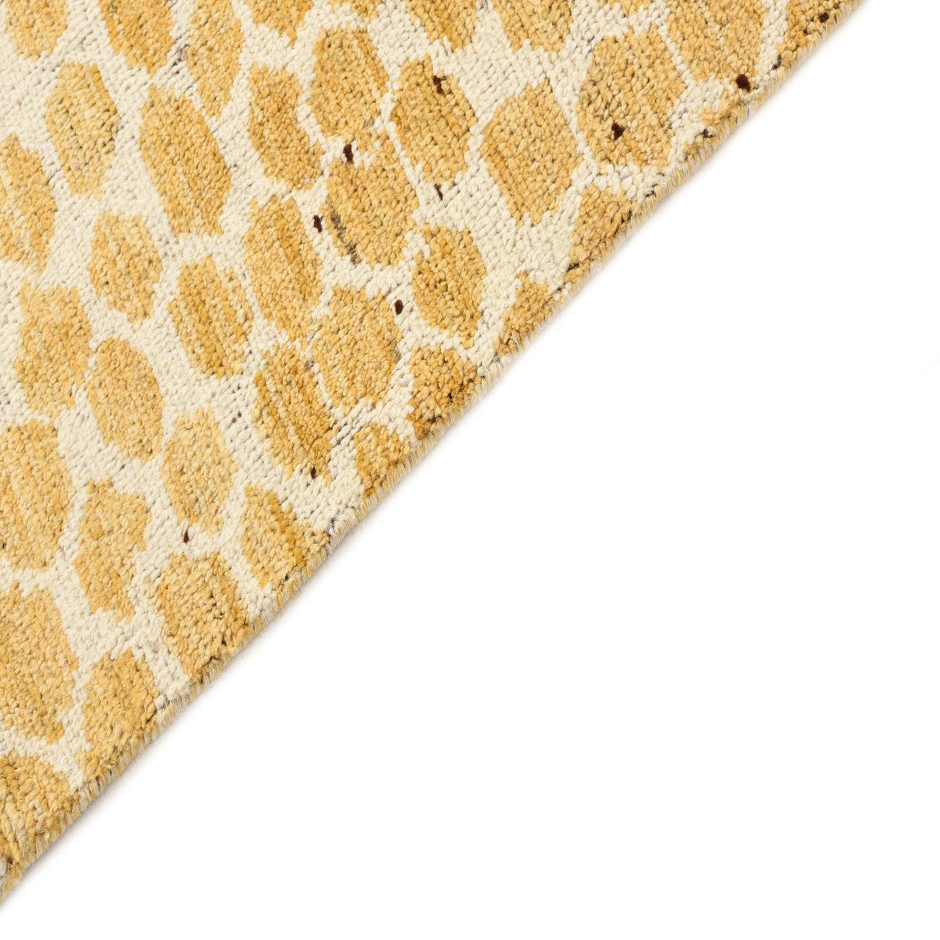 This Moroccan collection rug is a hand-knotted piece, meticulously crafted from 100% wool for durability and a soft underfoot feel. The rug measures 6x9, making it a versatile size for various room layouts. Its design features a vibrant yellow background with ivory accents, creating a bold yet harmonious color palette. The pattern consists of an array of geometric motifs reminiscent of traditional Moroccan designs, offering both a sense of history and contemporary appeal.
