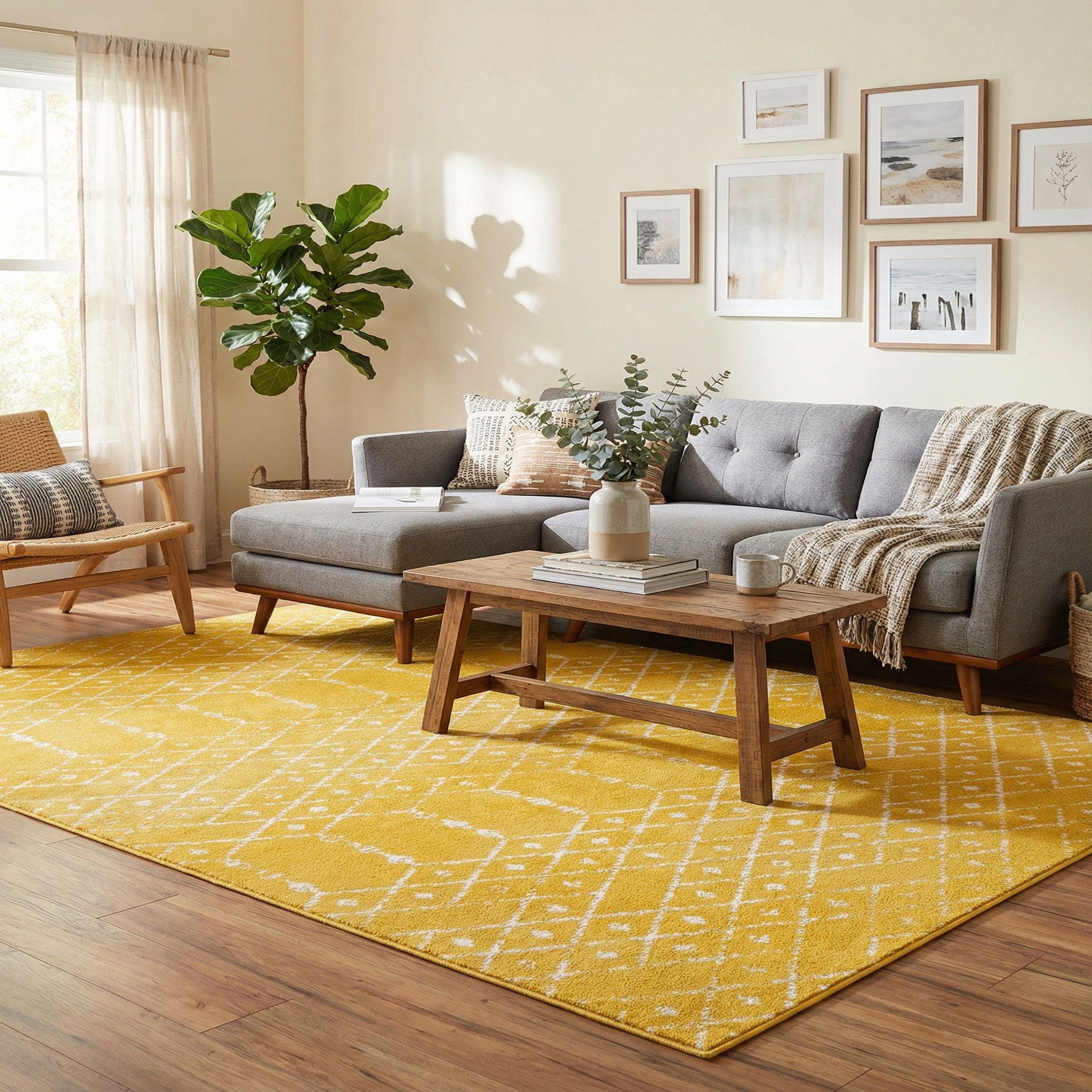 A 6x9 rectangular yellow area rug with a modern tribal trellis pattern in white, ideal for a living room.