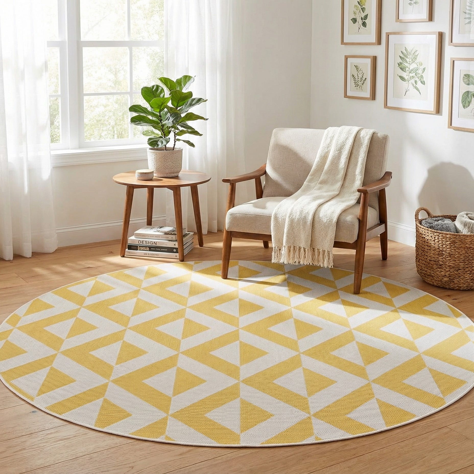 A round rug with a crisp geometric repeat, this design pairs ivory diamond motifs with a sunny yellow background to create a lively, modern look. The pattern of interlocking diamonds and chevrons gives the surface a structured rhythm, while the low-profile, tightly woven construction feels smooth underfoot with a slight tactile texture from the weave. Machine-made from 100% polypropylene, the flat surface has a clean, finished edge that keeps the graphic pattern looking sharp.