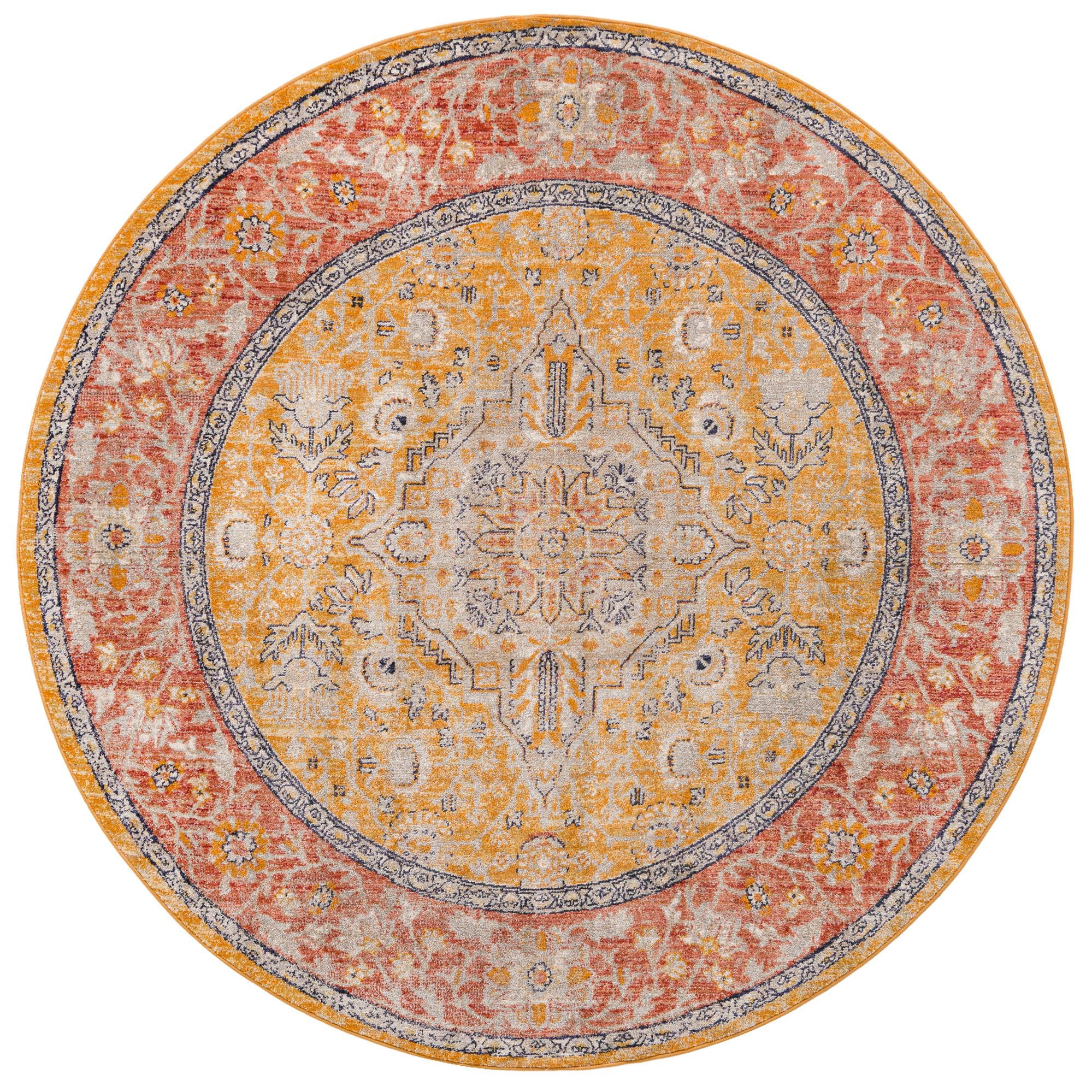 A 7' round yellow and orange bohemian rug with a central medallion and ornate border, perfect for an indoor living space.