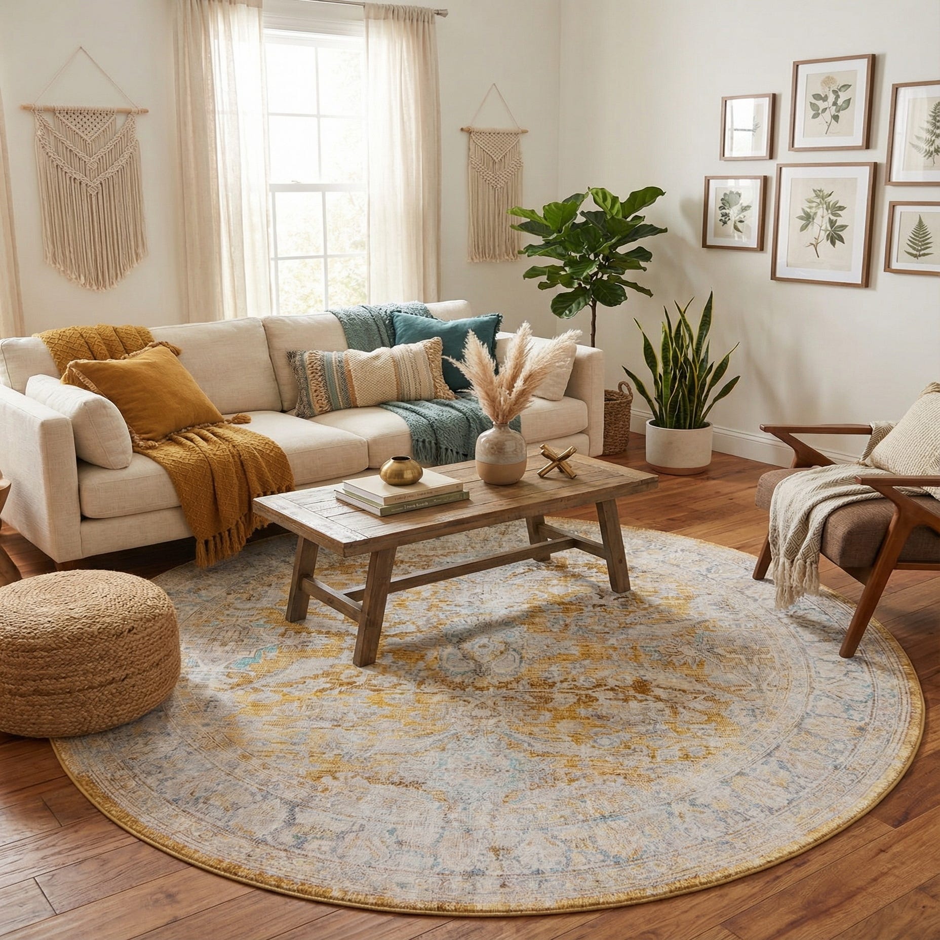 This round piece is well suited to anchor a seating group in a living room or create a focal point under a round dining table or breakfast nook. It pairs naturally with light-washed woods, linen upholstery, and brass or aged metal accents, and complements decor styles from transitional and coastal to modern boho. Use olive or violet throw pillows and soft blue accessories to draw out the accent tones and balance the rug’s warm yellow background.