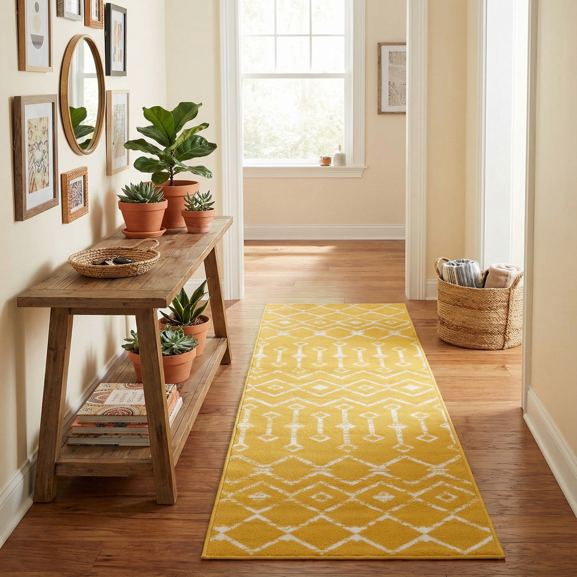 Designed for use in entryways, hallways, or alongside a bed, this runner brings a sunny accent to transitional, bohemian, or mid-century interiors. Pair it with natural wood tones and linen upholstery for a relaxed, layered feel, or use it to brighten a neutral kitchen with white cabinetry and brass hardware. It also works well layered over a larger neutral rug to add a pop of color and pattern in a living room or long corridor.