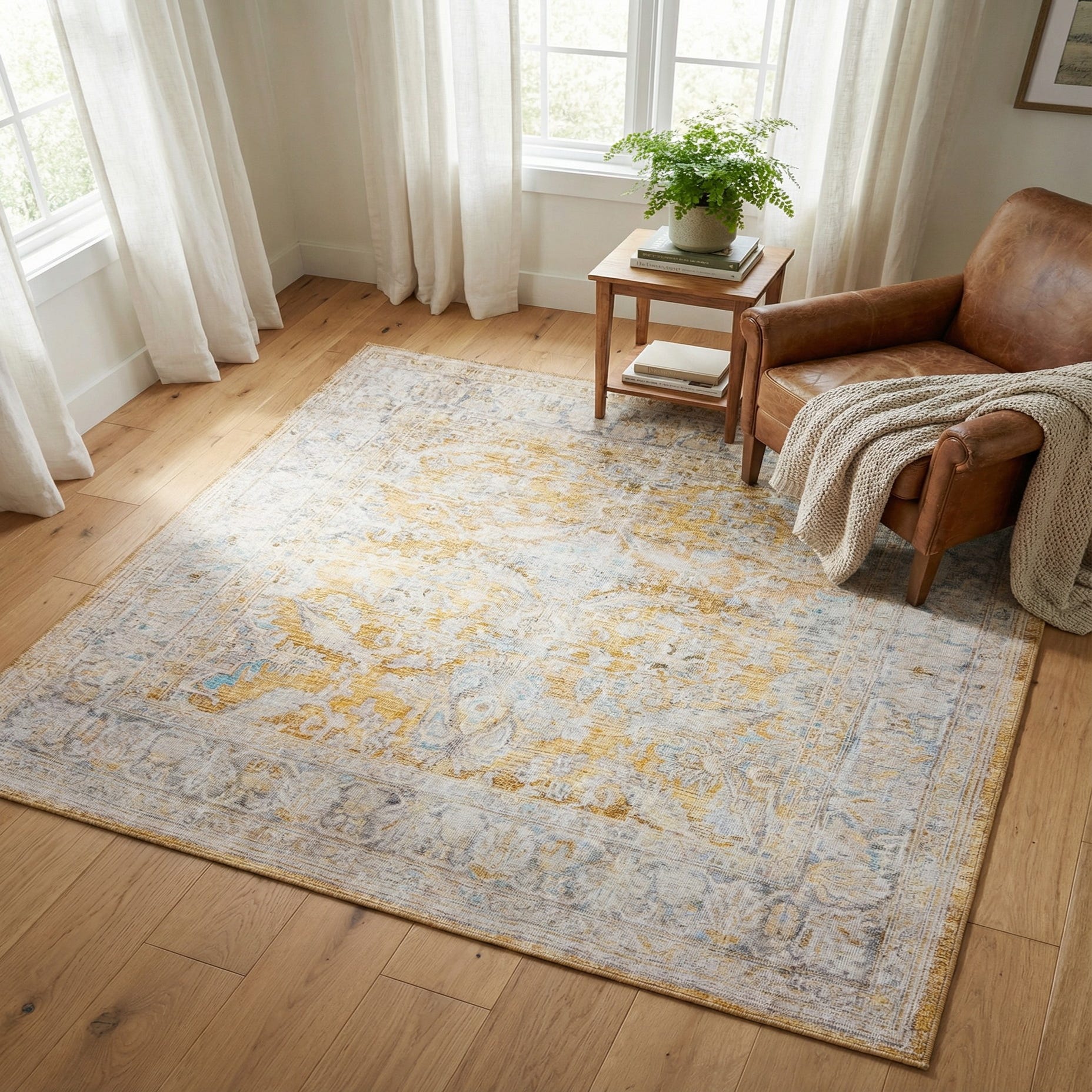 Place this rug to anchor a seating area or beneath a dining table where the warm yellow brings sunlight indoors. It pairs well with light wood furniture and ivory upholstery for a breezy, transitional look, or add olive and violet textile accents for a relaxed eclectic or modern-bohemian scheme. In a bedroom it softens hardwood floors; in an entry or sunroom it introduces color and pattern while keeping the overall feel casual and approachable.