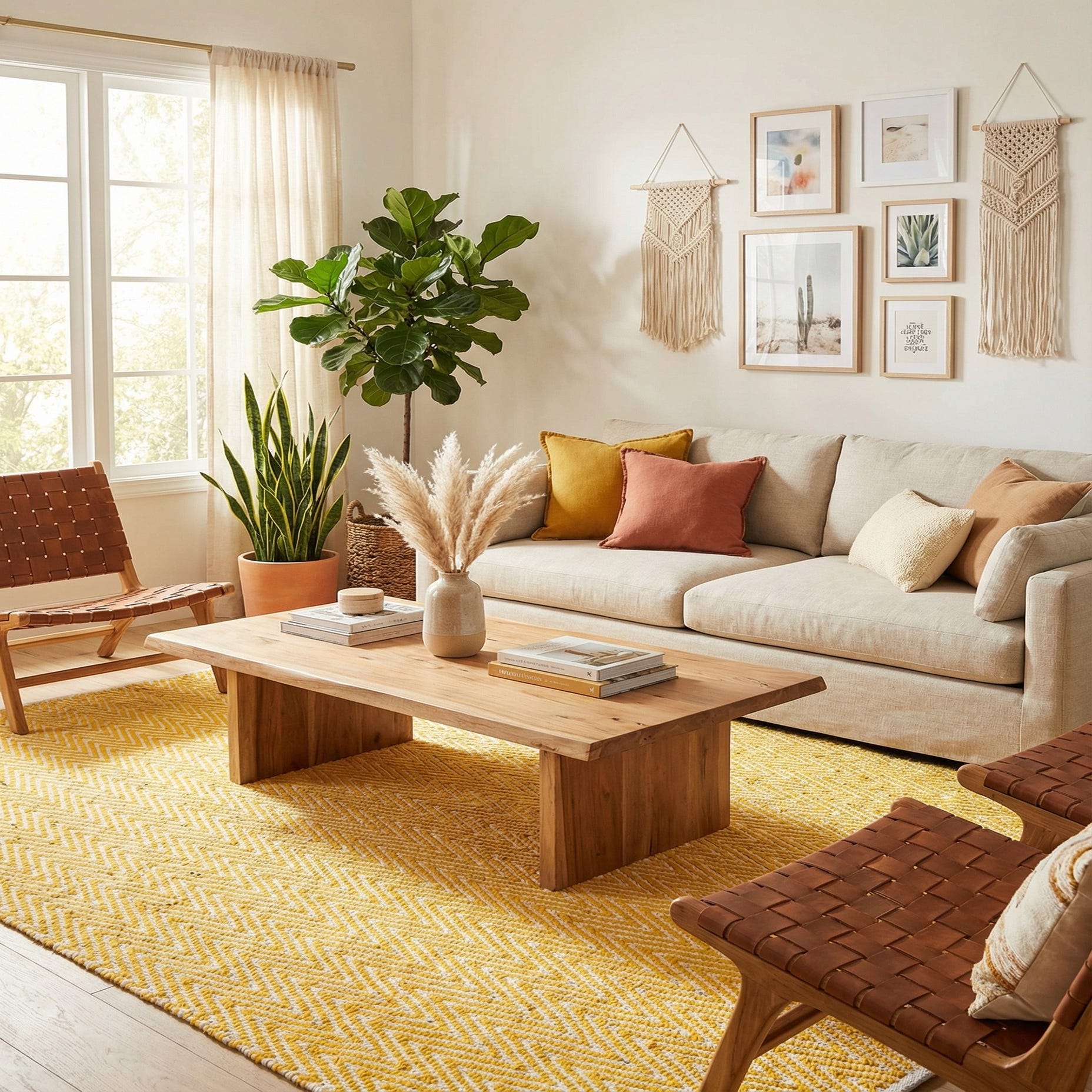 Hand woven cotton construction gives this rug a casual, approachable feel that works well in a variety of interiors. Place it under a mid-century modern sofa to amplify clean lines and warm tones, use it beneath a dining table to introduce pattern without overwhelming the space, or layer it in a bright bedroom or sunroom to add energy and texture. It pairs naturally with light woods, white or neutral upholstery, navy accents, and woven materials like rattan or seagrass.