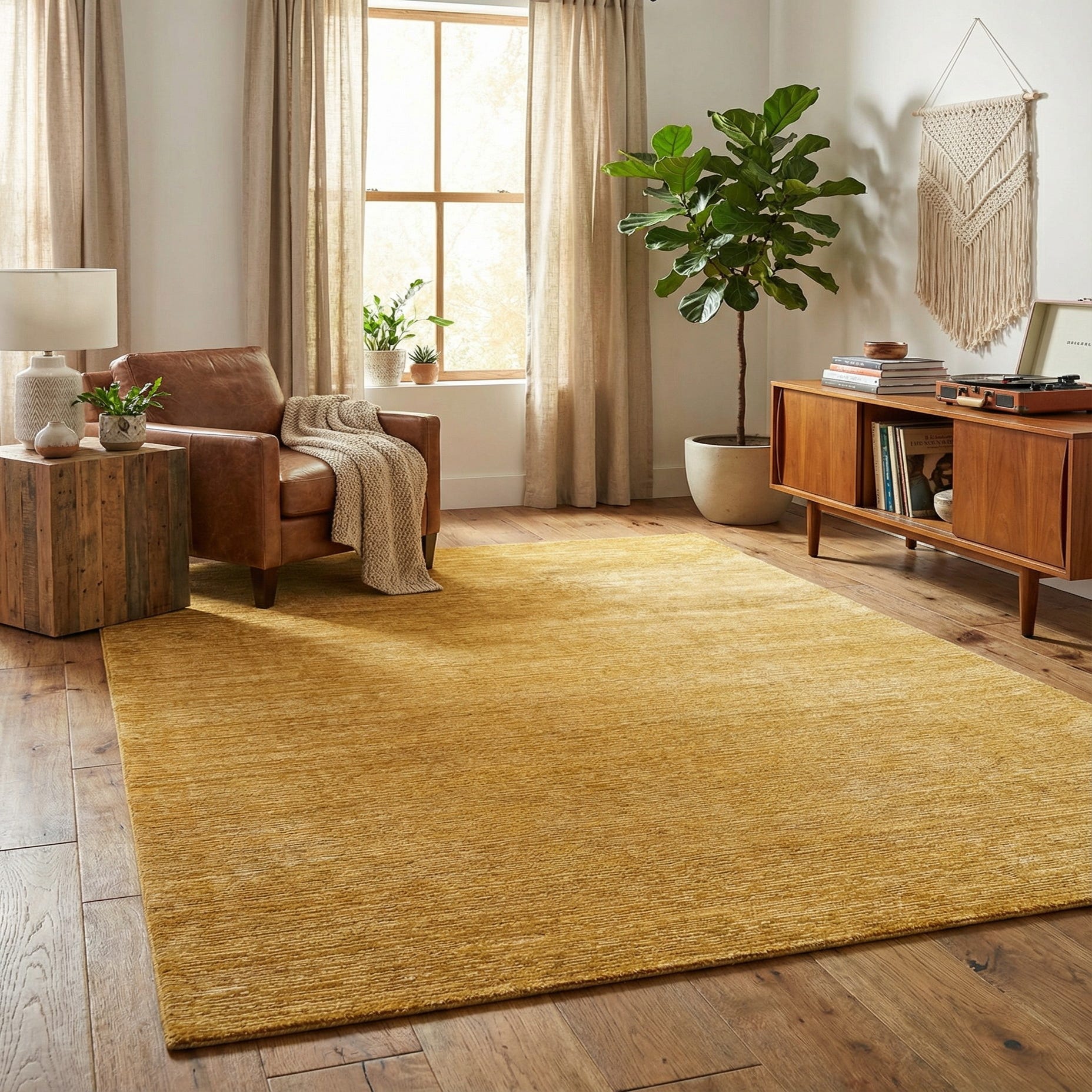 This rug works well as an anchor in a living room beneath a sofa and coffee table, under a dining table to introduce color without competing with tableware, or in a bedroom to warm neutral linens. Pair it with mid-century wood pieces and leather accents for a cozy, modern vibe, or layer it with cool grays, white walls, and brass fixtures for a brighter, contemporary scheme. The straightforward color and texture make it easy to integrate into a range of interiors where subtle warmth and clean lines are desired.