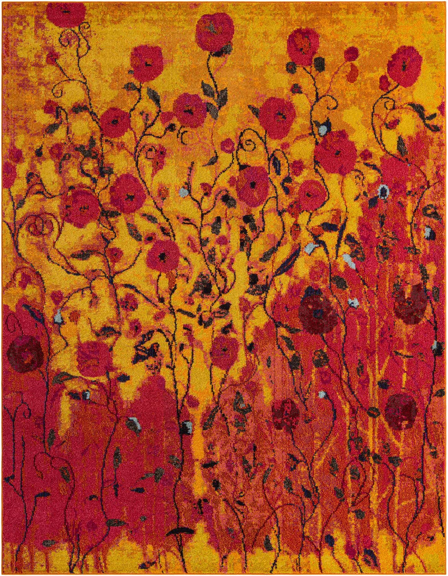 Primary color is Yellow. Colors in this rug include: Yellow, Light Blue, Navy Blue, Orange, Puce, Red.