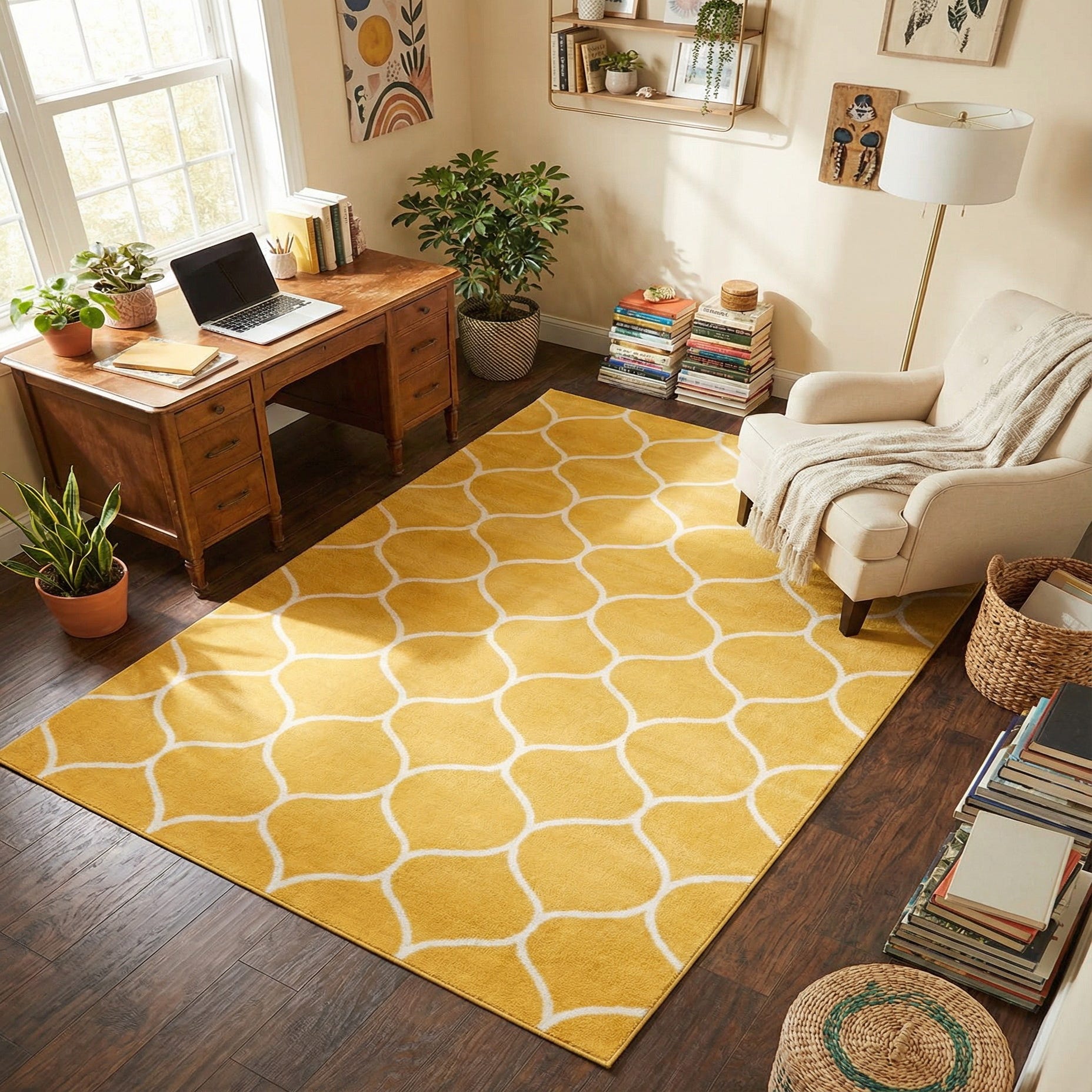 A bright yellow field provides a sunny backdrop for a repeating ivory ogee lattice that brings soft geometry to the surface. The pattern’s rounded, interlocking shapes create a steady, rhythmic presence without feeling busy, while the ivory lines offer crisp contrast against the warm background. Machine-made from 100% polypropylene, the rug has a smooth, velvety hand with a low-to-medium pile that feels pleasantly soft underfoot and maintains a neat, tailored appearance.