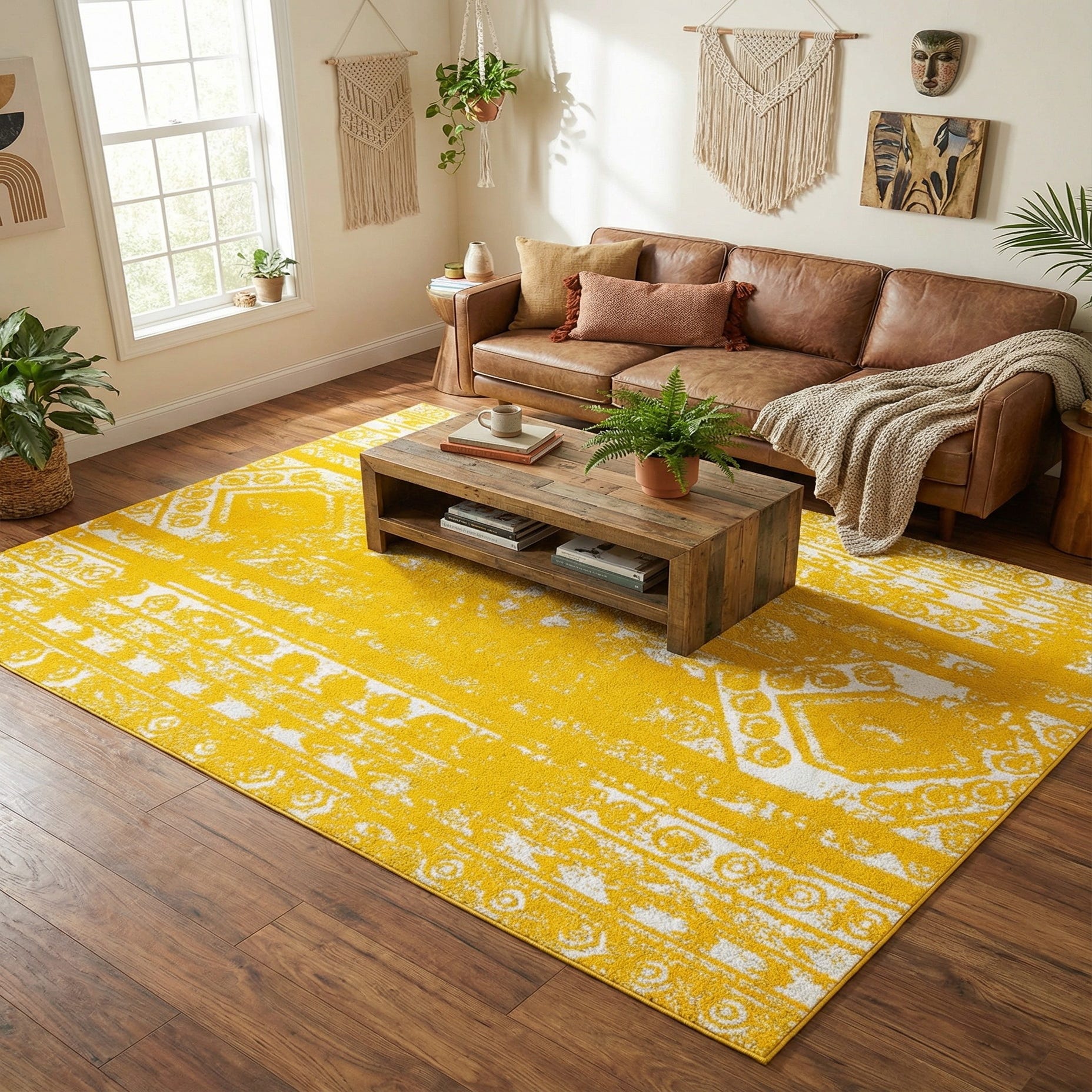 A bright yellow ground sets the stage for a distressed, tribal-inspired pattern rendered in soft ivory. The design pairs vertical banding with geometric medallions and small circular motifs, creating a layered, timeworn look that still feels fresh. Machine-made from 100% polypropylene, the rug has a low, dense pile that feels smooth underfoot and shows subtle texture where the ivory pattern rises against the yellow background.