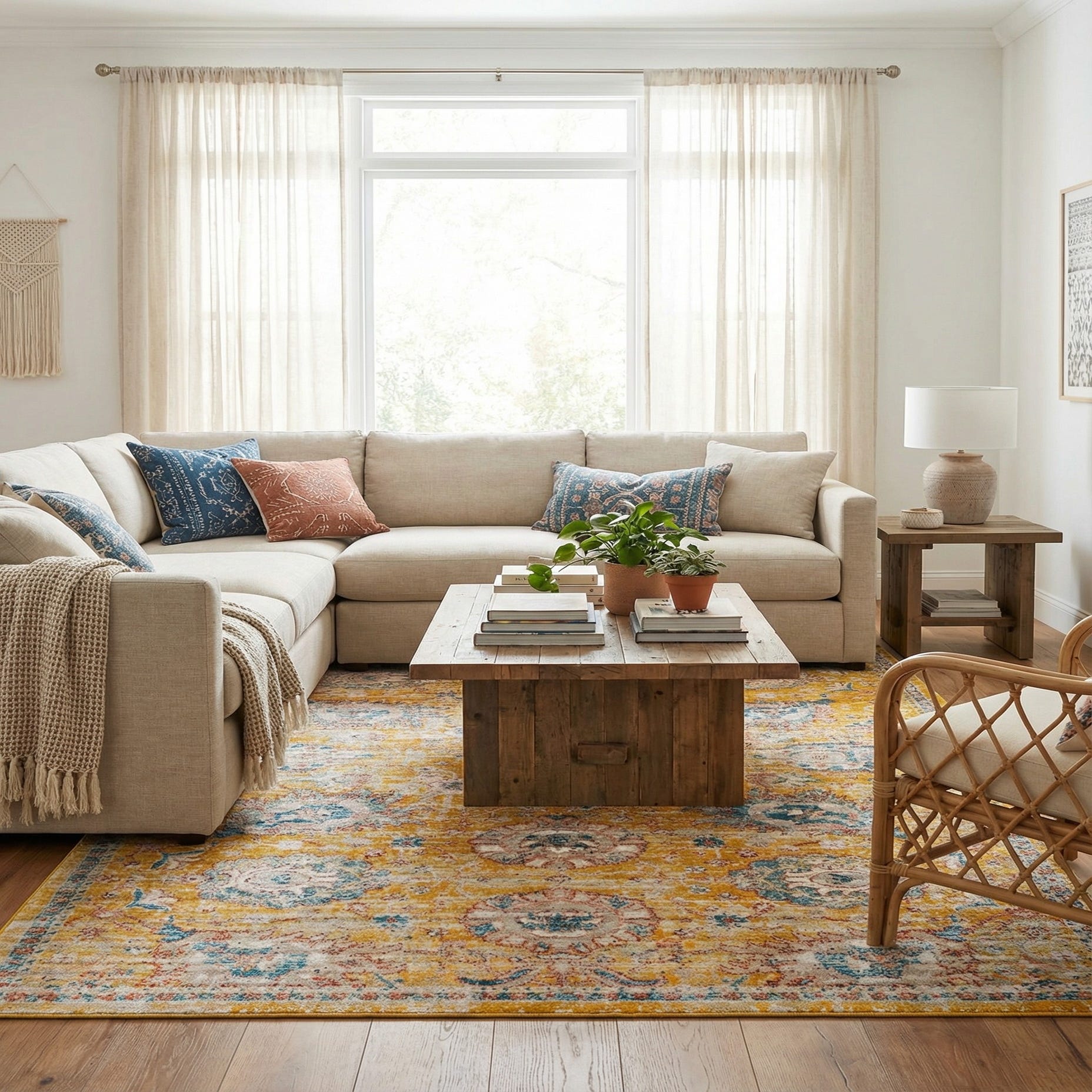 This rug works well as an anchor for a living room seating area, beneath a coffee table to introduce color against neutral upholstery, or layered in a bedroom to add warmth and pattern. It complements natural wood tones, rattan and woven textures, and pairs nicely with mid-century or transitional furnishings—try pairing it with light blue accents or rust-red pillows to pick up the motif colors.