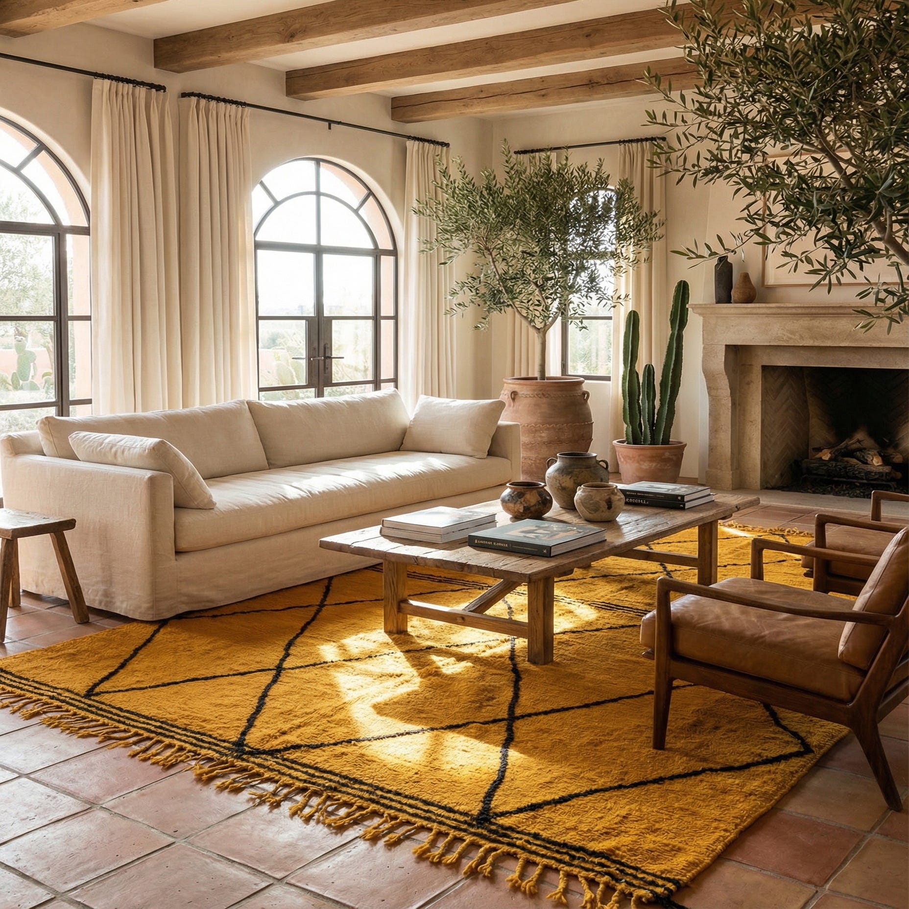 A 7x10 rectangular yellow Moroccan shag rug with a black tribal diamond pattern and fringed edges.