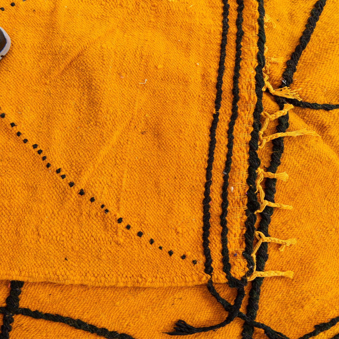 This Moroccan Collection hand-knotted rug presents a bold and inviting yellow backdrop with a contrasting black diamond pattern, creating a striking visual impact. Crafted from 100% wool, the rug exhibits an appealing texture and a lasting durability. Measuring 7x10, this semi-antique piece carries the weight and warmth of history, enhanced by the authenticity of its fringed edges.