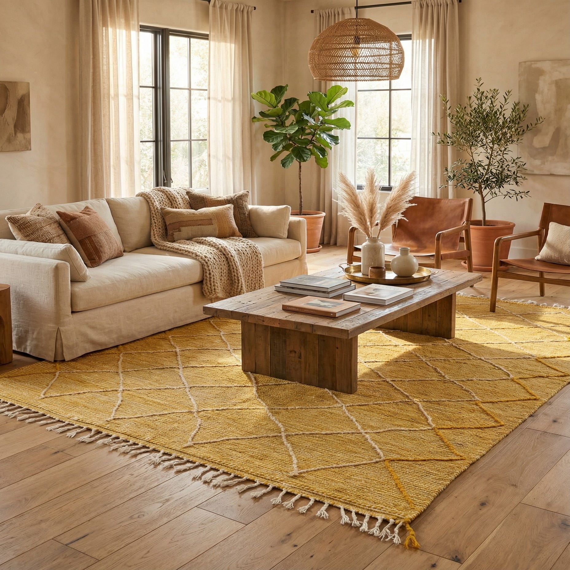 A 7x10 rectangular yellow wool shag rug with a white tribal diamond pattern and fringe.