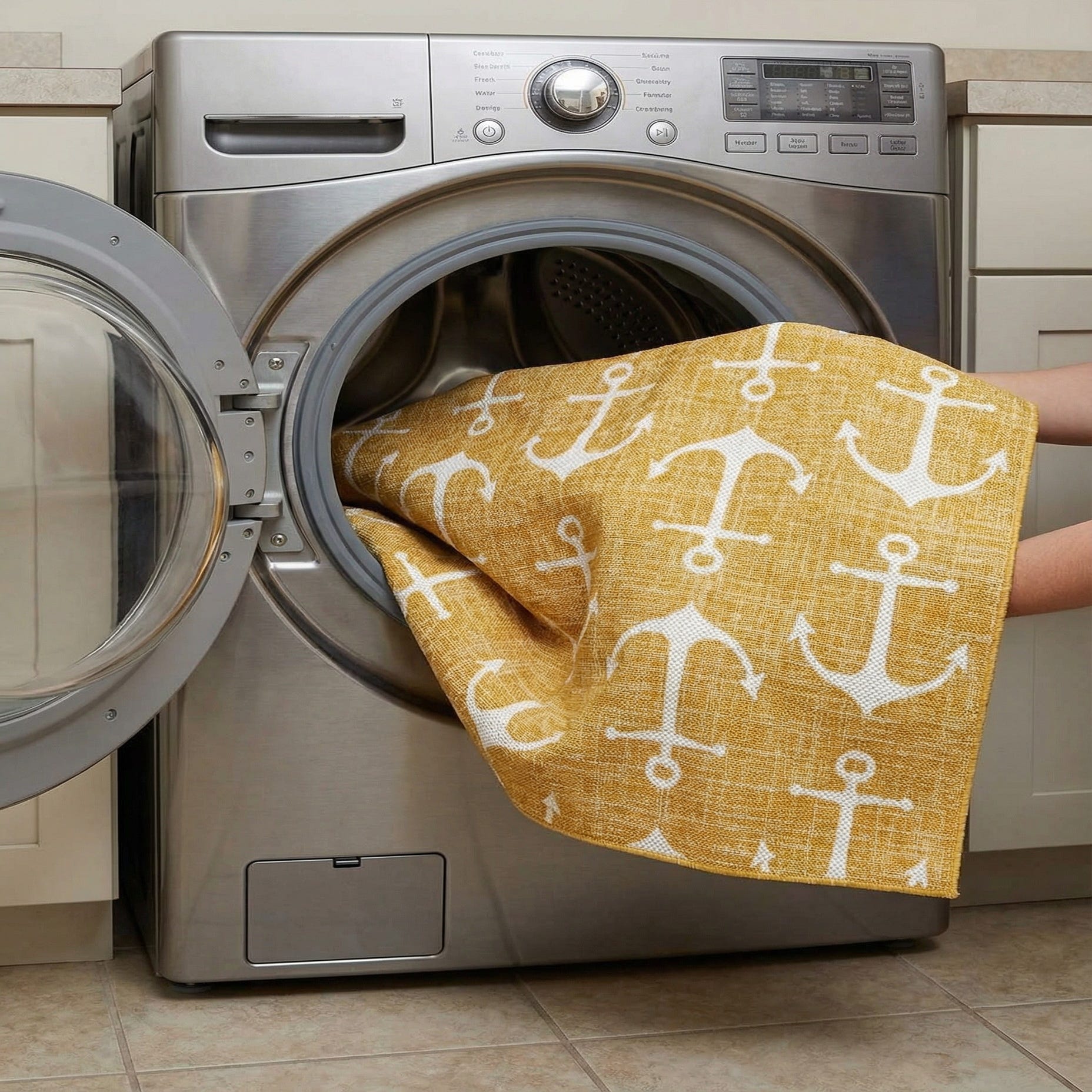 Octagon 7' 10 x 7' 10 yellow and white rug with a repeating nautical anchor pattern, suitable for a patio.
