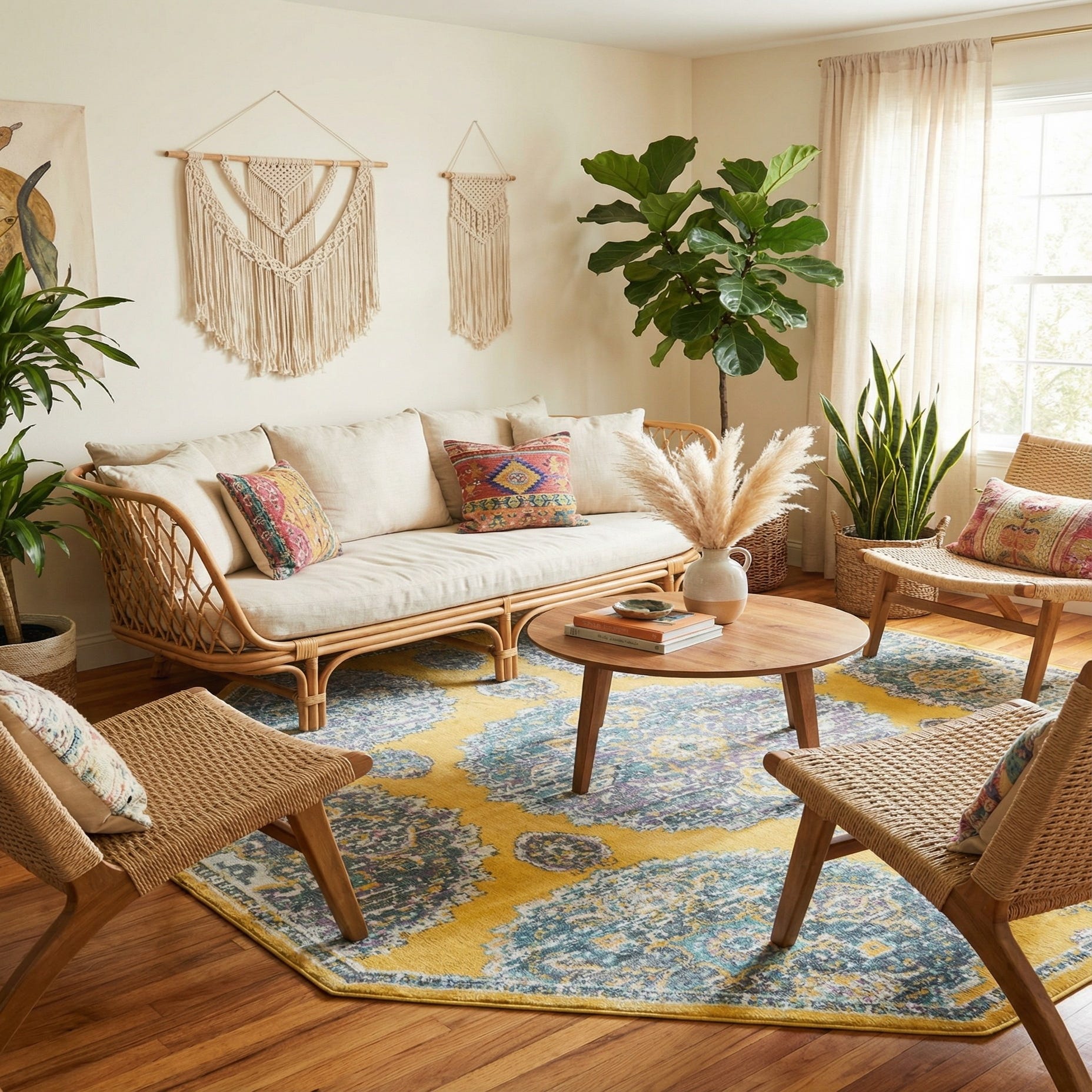 Octagon-shaped yellow and gold Bohemian rug with a distressed floral pattern in shades of blue, purple, and gray.