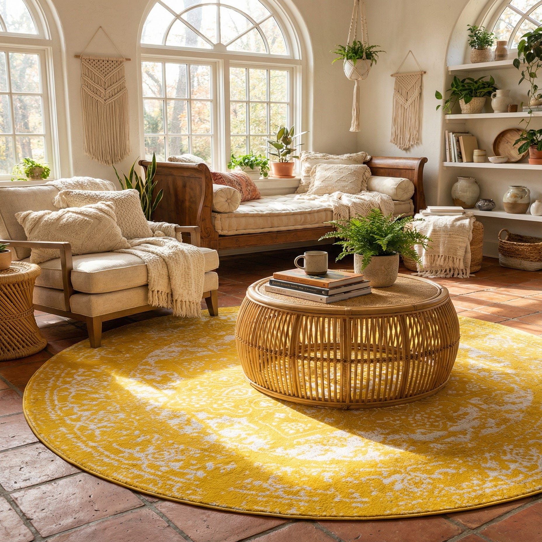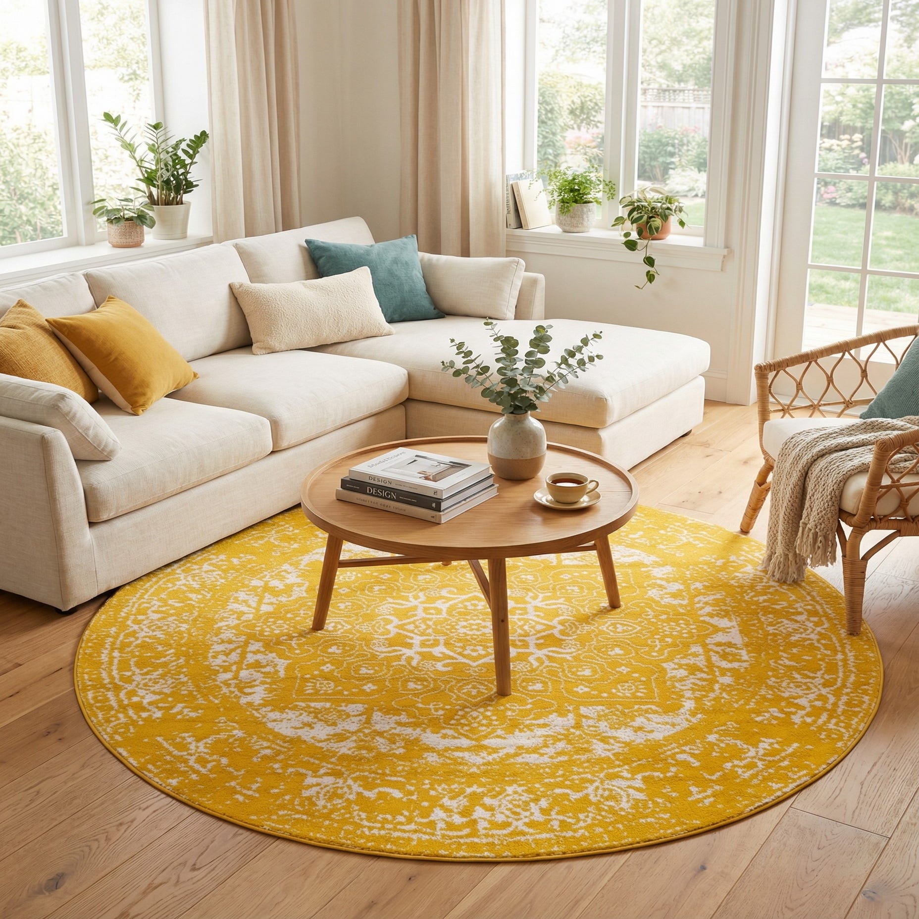 This round design works well as an anchor under a circular dining table, brightening a breakfast nook or breakfast area, and it also livens a living room when placed beneath a coffee table and paired with neutral seating. Use it to add a pop of color in a sunroom or entryway, or to complement mid-century, coastal, or contemporary farmhouse furnishings—its warm yellow and ivory palette pairs particularly well with natural woods, rattan accents, and crisp white textiles.