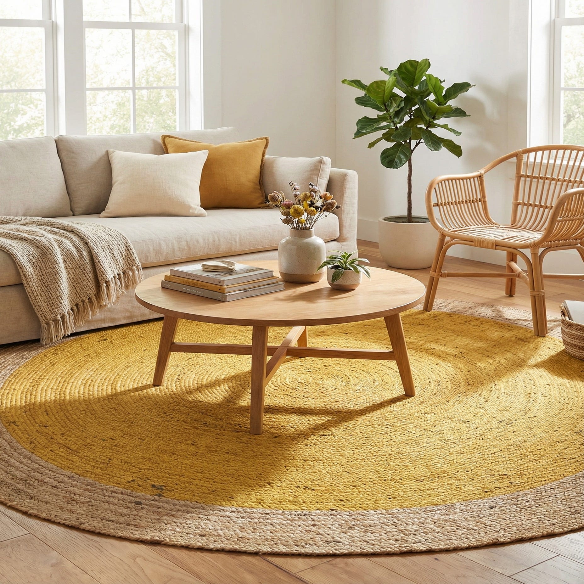 A round 8' yellow jute rug with a natural braided border, showcasing its textured, eco-friendly design.