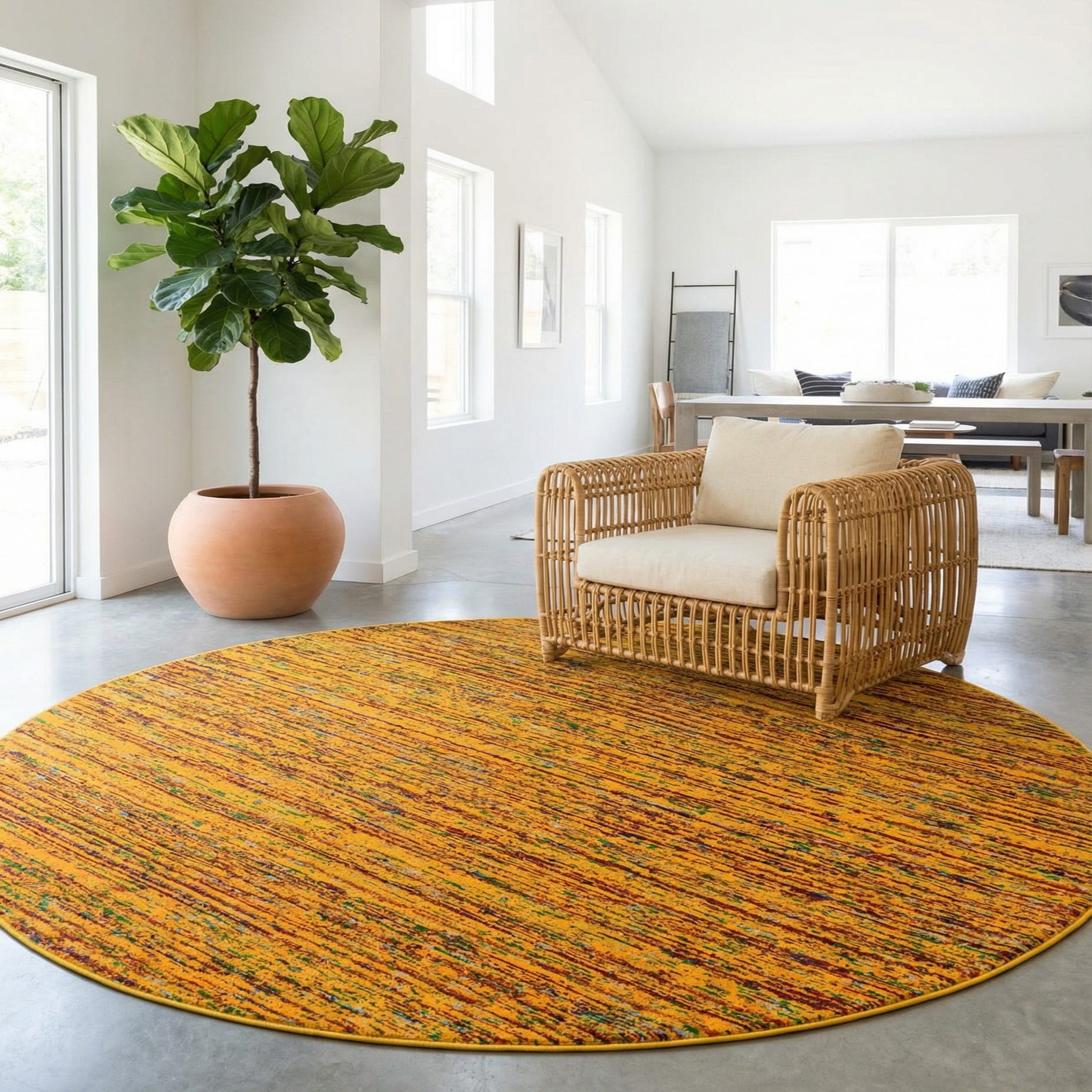 A round rug with a warm yellow ground punctuated by fine, horizontal striations in blue, light blue, green, red and orange. The pattern is composed of closely spaced, multicolored bands that overlap and break in places, creating a subtle, painterly texture across the surface. The overall style leans contemporary with a lively, bohemian edge—colorful without being fussy, and visually textured without heavy pile.