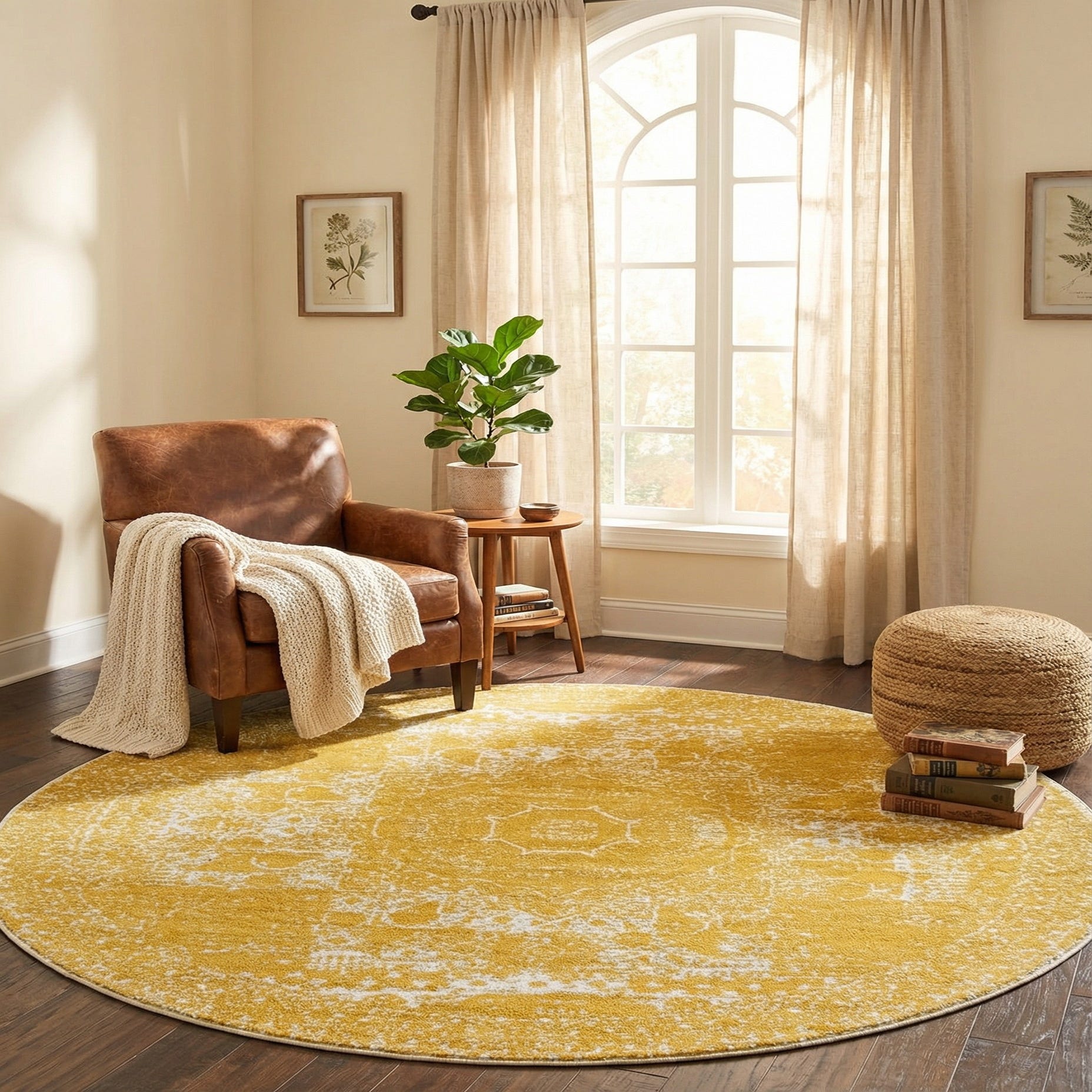 A warm yellow ground sets the tone, with an ivory, vintage-inspired medallion and border pattern worked into a gently distressed finish. The round layout highlights the central motif while the faded detailing and subtle tonal shifts give the surface visual depth. Machine-made from 100% polypropylene, the rug has a low-profile cut pile with a smooth, slightly plush hand that feels comfortable underfoot and holds a neat, tailored appearance.