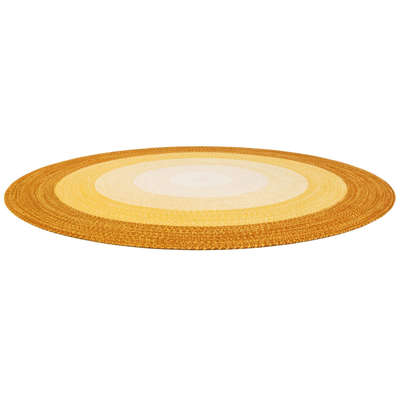A round, hand-braided wool rug with concentric circles of yellow and gold, featuring a modern design.