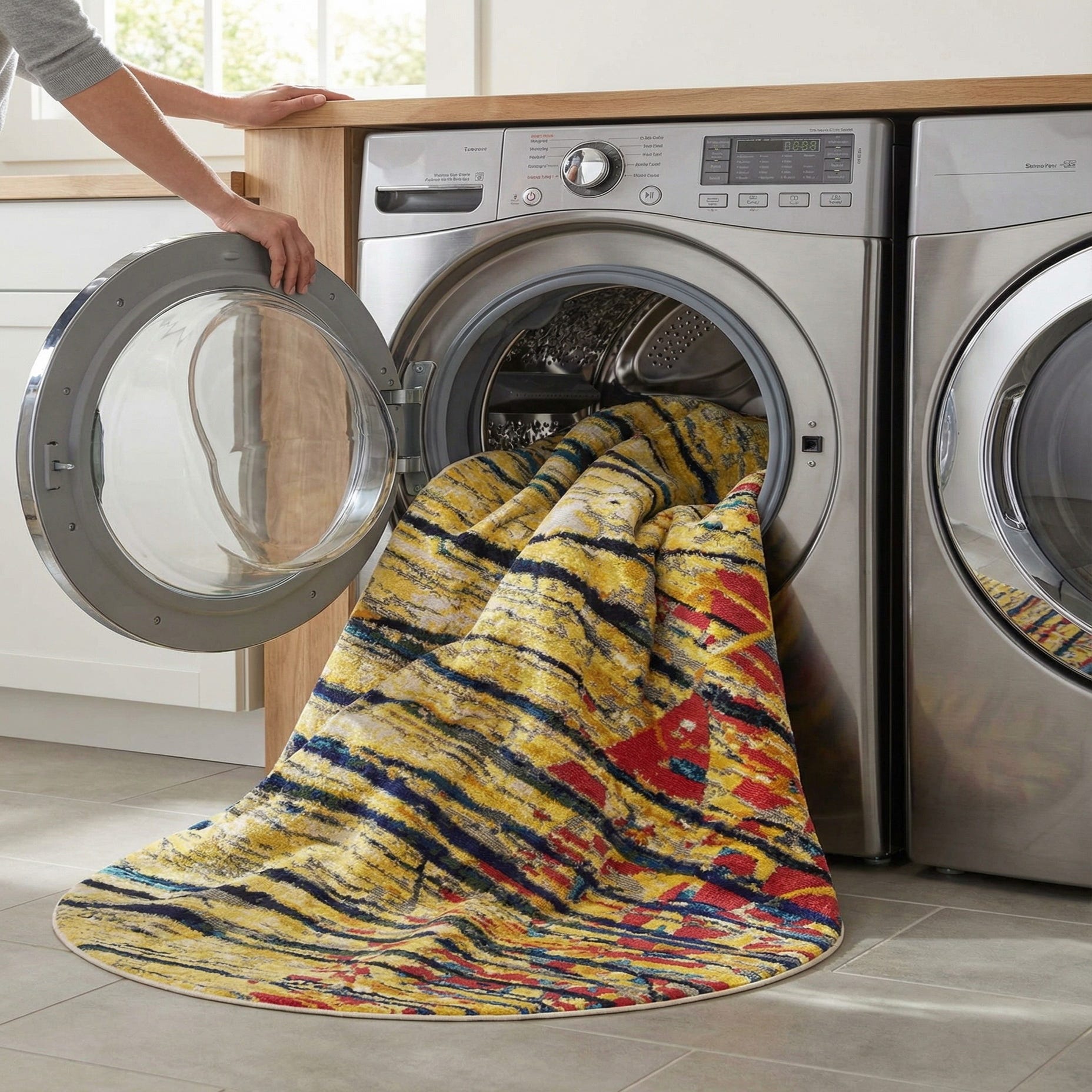 Pair this rug with mid-century modern seating to emphasize its clean vertical lines, or layer it beneath a round dining table to create a bold focal point in an open-plan living space. It also complements eclectic or industrial interiors where bright color accents are welcome, and works well in a media room or reading nook to ground seating arrangements. Neutral upholstery, natural wood finishes, and simple metal accents will let the rug’s palette and pattern take center stage while tying the room together.