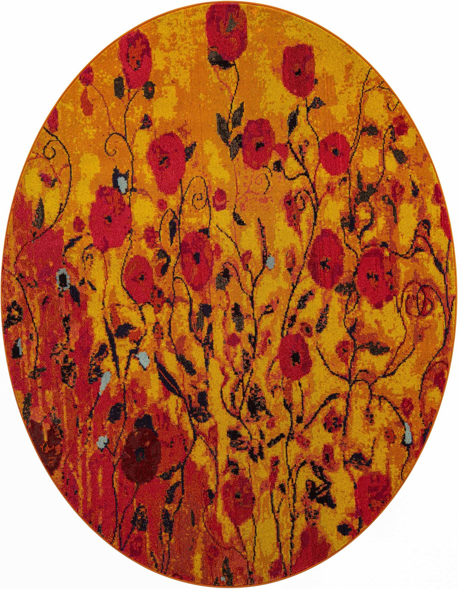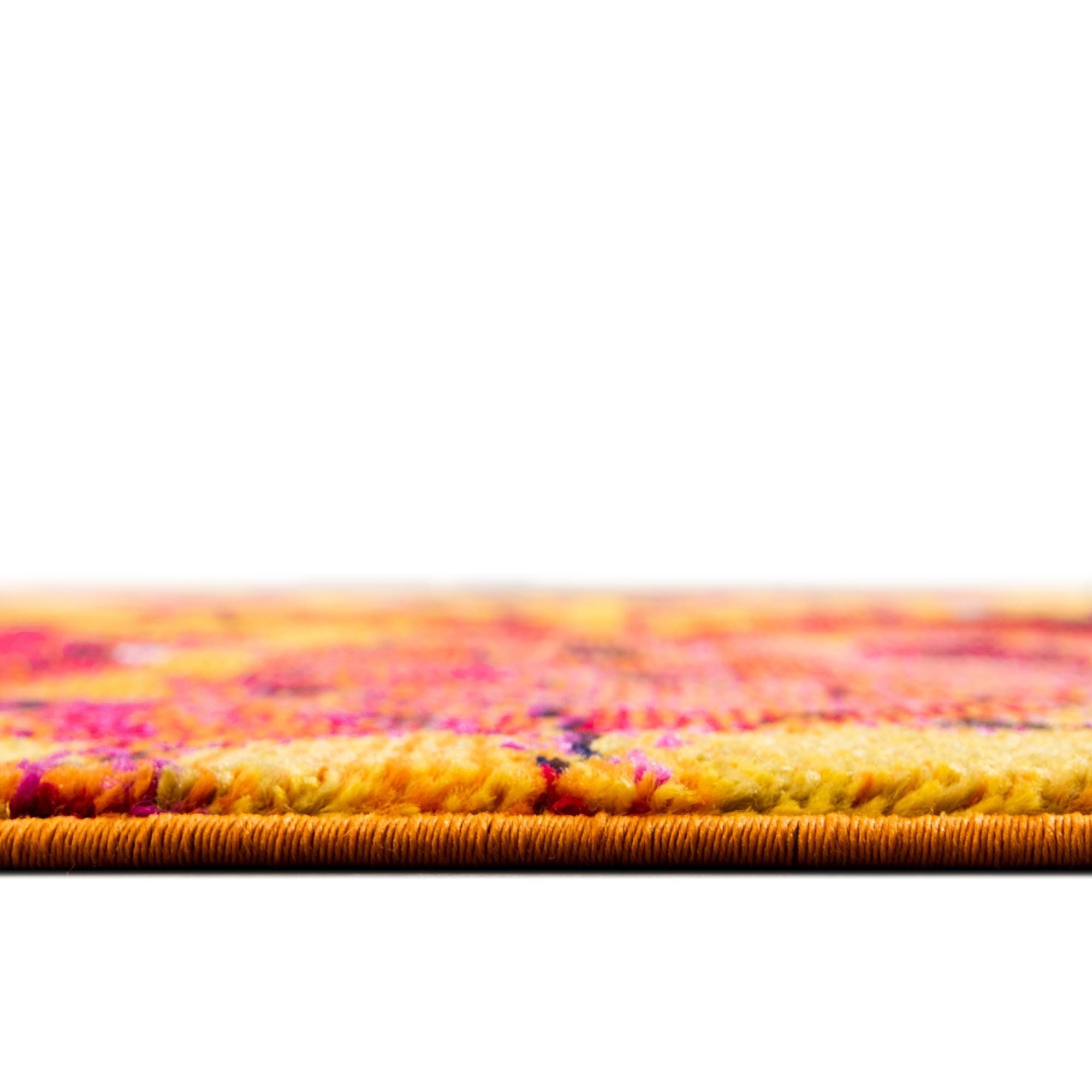 Primary color is Yellow. Colors in this rug include: Yellow, Light Blue, Navy Blue, Orange, Puce, Red.