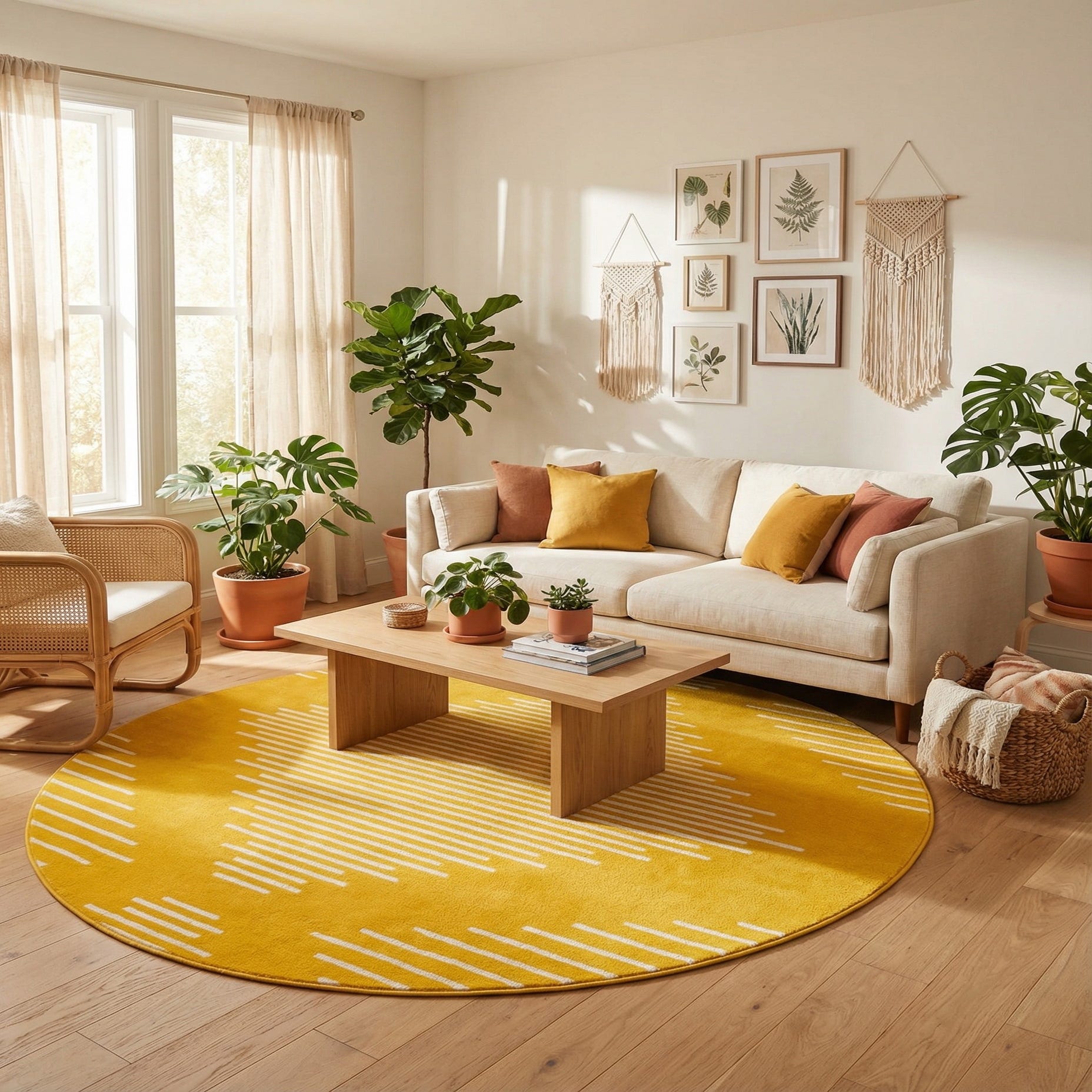Machine-made from 100% polypropylene, this rug offers a consistent weave and crisp pattern definition. The bright yellow and ivory palette brings warmth and energy to contemporary and mid-century modern schemes, and it pairs especially well with natural wood tones, white or light gray furnishings, and simple metallic accents. Use it to anchor a small dining set, center a casual seating area, or add a lively focal point in a sunroom, entry, or play space.