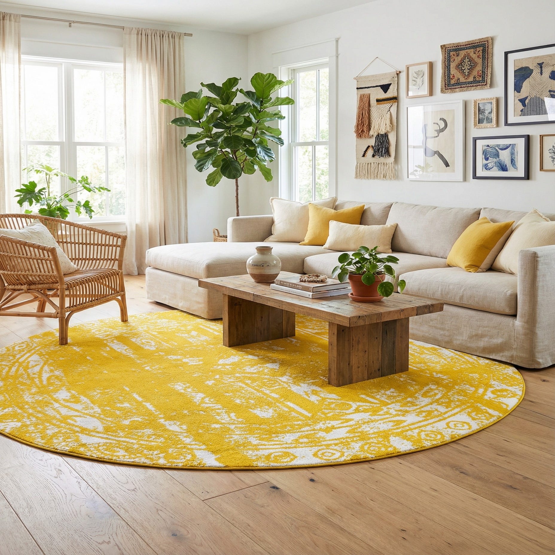 The yellow and ivory palette provides a warm, graphic layer that suits a variety of interiors. It works well beneath a round dining table or in a breakfast nook to anchor seating, and it suits a sunroom, entryway, or children's play area where a resilient surface is useful. Pair it with light woods and neutral upholstery for a modern, upbeat look, or combine it with rattan and natural textures for a casual, transitional scheme.