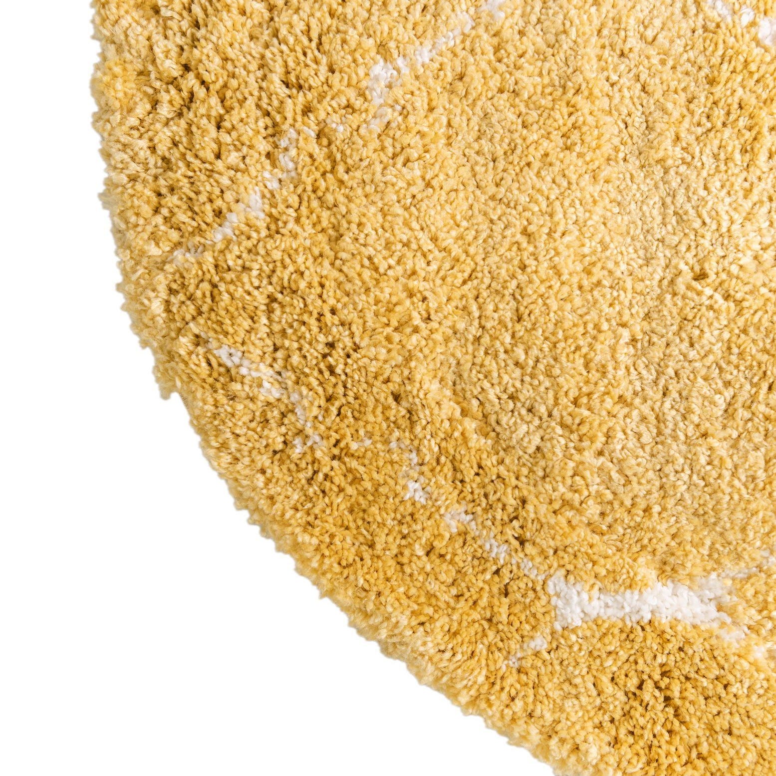 A round shag with a Moroccan-inspired trellis pattern, this rug pairs a sunny yellow ground with soft ivory lattice lines for a relaxed, modern look. The high, dense pile feels cushiony underfoot — run your hand across the surface and you’ll notice the plush, slightly variegated texture that gives the pattern gentle depth. Machine made from 100% polypropylene, the construction delivers a consistent shag profile and a soft, tactile finish.