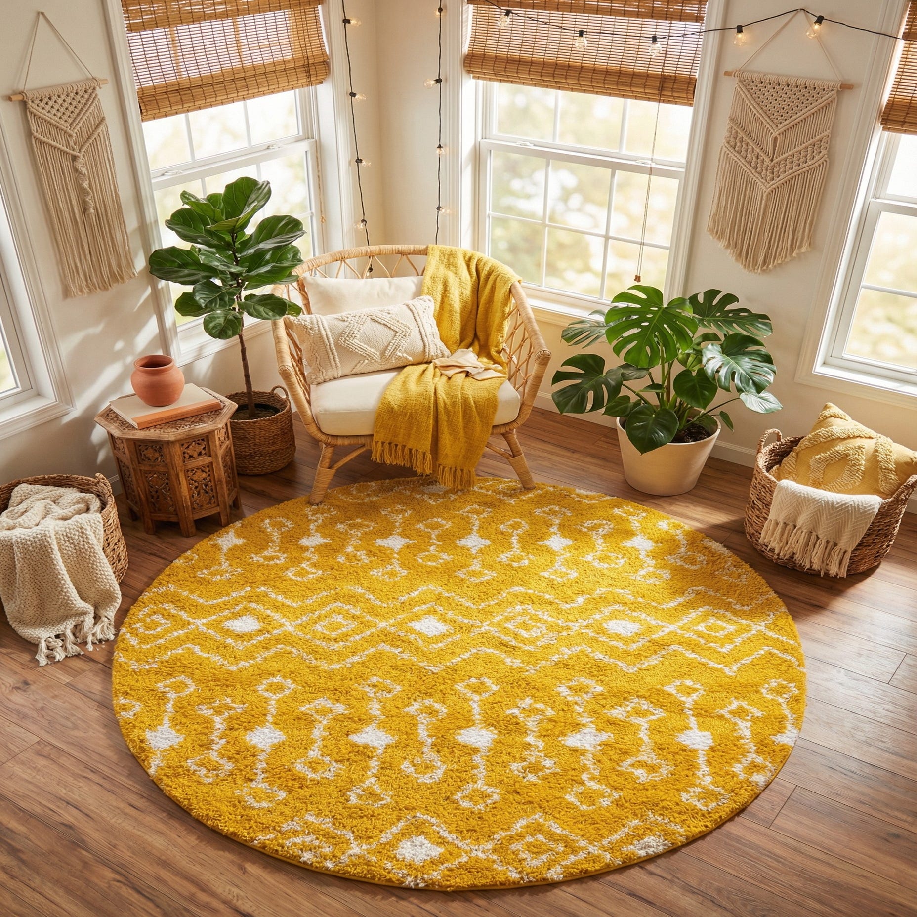This round shag works well as an anchoring piece in a living room beneath a coffee table, layered under a small dining set, or placed beside a bed to add a cozy, upbeat focal point. Pair it with natural wood or rattan furniture and neutral linens for a relaxed, bohemian feel, or contrast the brightness with navy or charcoal accents for a modern mid-century palette. It also fits playful, casual spaces like a sunroom or child's room where a lively color and soft underfoot feel are welcome.