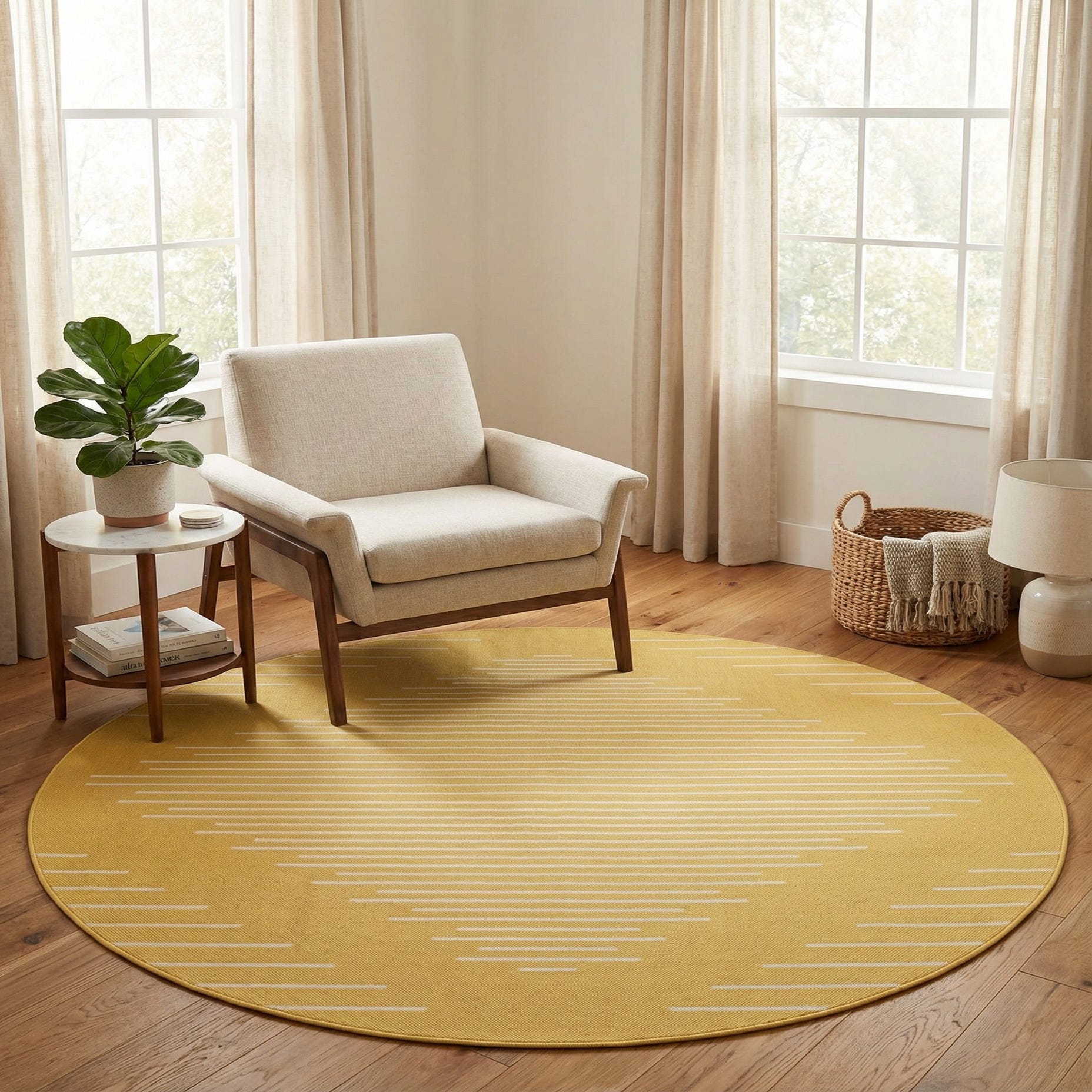 The bold yellow hue paired with the minimalist pattern makes this rug a versatile choice that can enliven patios, decks, or poolside areas while complementing a broad range of decor themes from mid-century modern to coastal chic. Additionally, the stain-resistant nature of the material allows for simple cleanup, making it ideal for entertaining or family gatherings outdoors. This round rug works particularly well under round patio dining tables or centered with seating for a cohesive look.