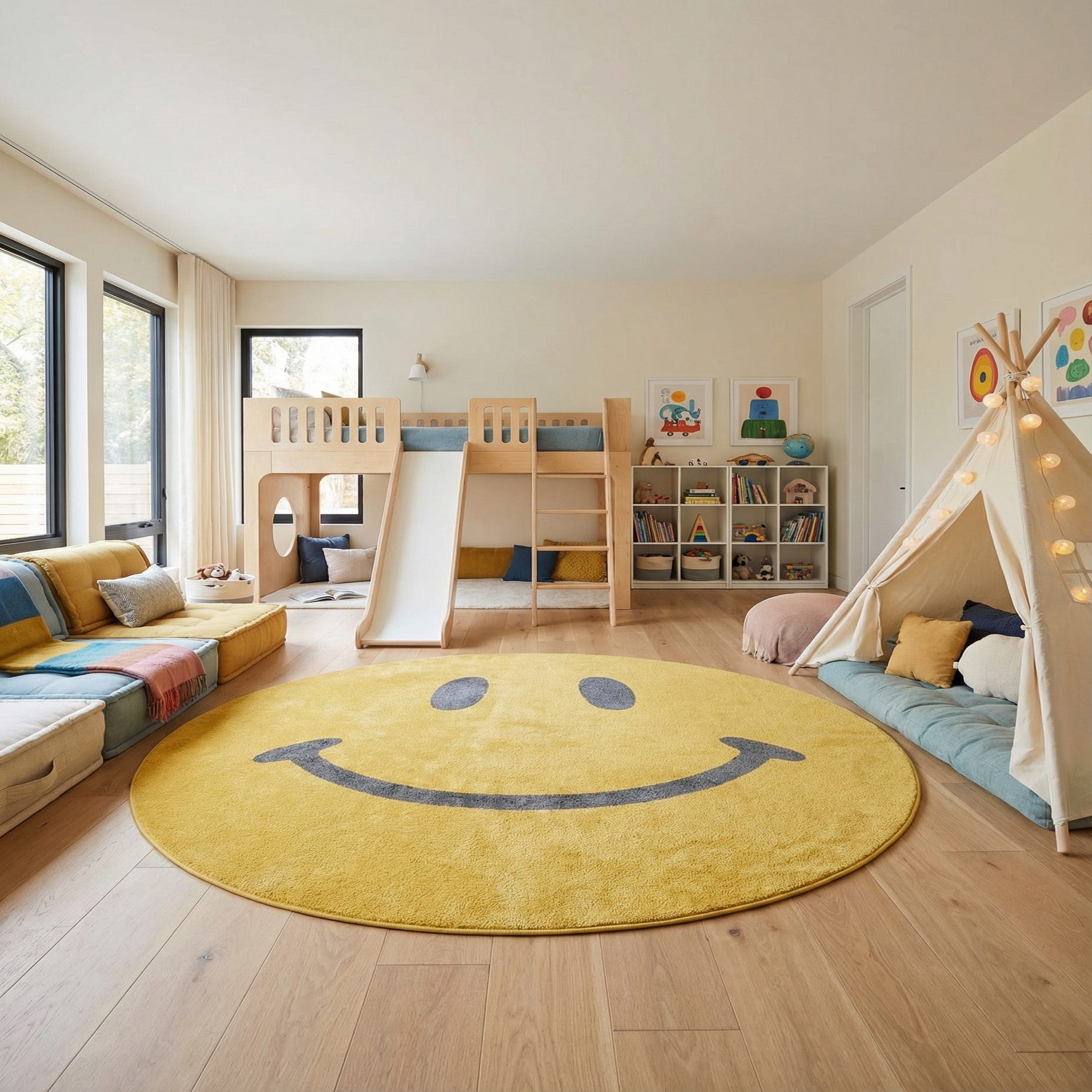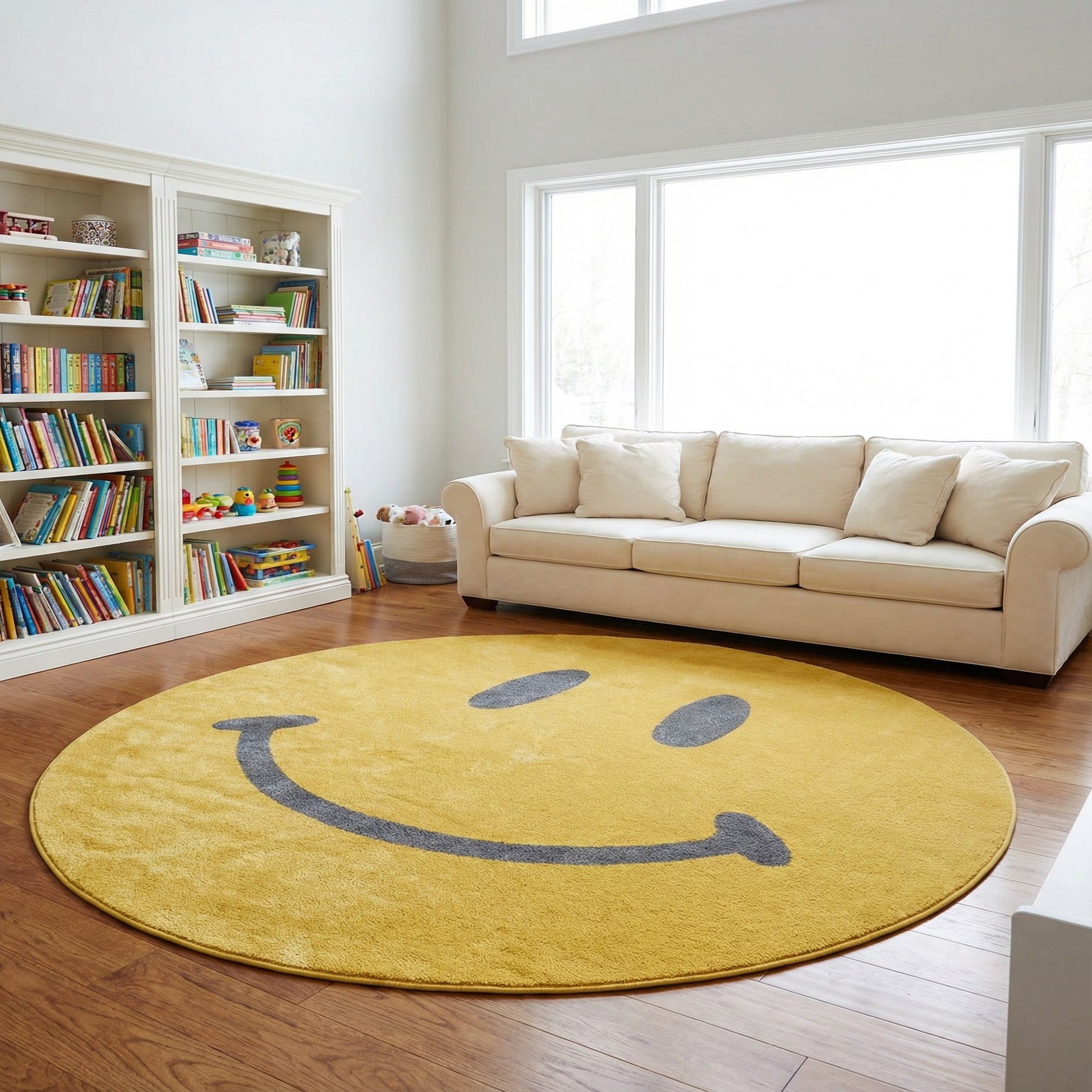 A bright yellow round rug with a bold, graphic smiley face in deep black brings a playful, modern touch to any room. The pattern is simple and iconic—two oval eyes and a wide curved mouth sit cleanly against the warm yellow background, creating a friendly focal point that reads contemporary and fun. The overall style leans toward pop-art and kid-focused design while staying versatile enough for casual, creative spaces.